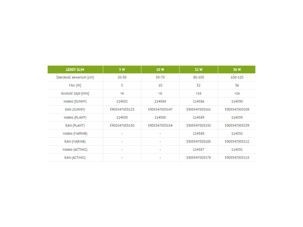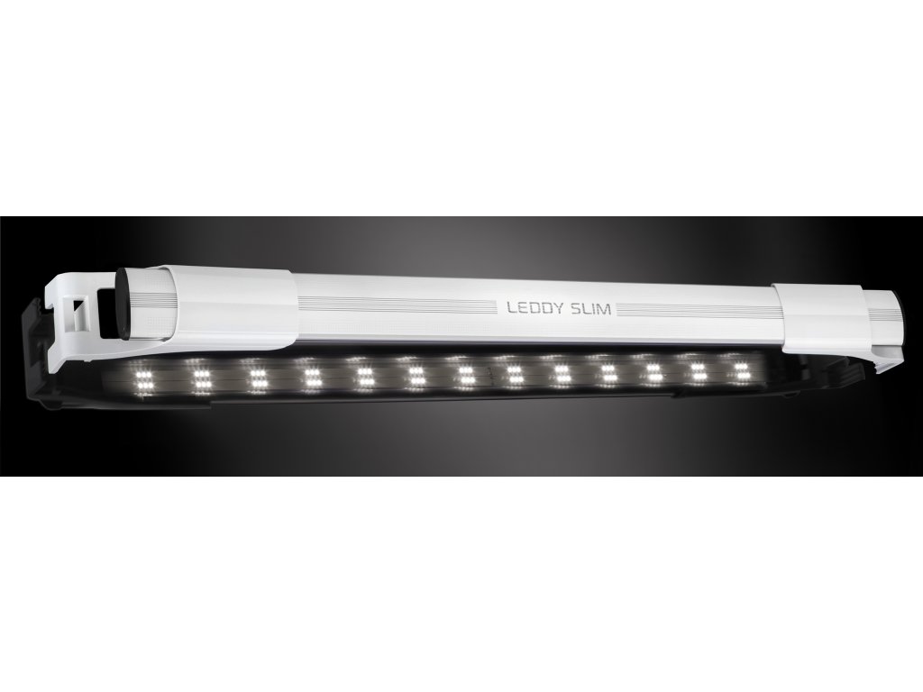 Inovatívne žiarovky LEDDY SLIM určené na osvetlenie otvorených nádrží (bez krytu), sladkých aj morských. Obsahujú starostlivo vybrané LED diódy, ktoré zabezpečujú dokonalé osvetlenie nádrže a zaručujú vynikajúce životné podmienky pre jej obyvateľov a jedinečný vizuálny efekt. Plochý, futuristický tvar a moderná biela farba umožňujú dokonalé splynutie s modernými akváriovými nádržami a skvelý vzhľad v každom interiéri. Okrem toho sú univerzálne - výsuvné konzoly umožňujú ich inštaláciu na akváriách rôznych dĺžok vrátane nádrží neštandardných rozmerov. LEDDY SLIM žiarovky sú k dispozícii v štyroch verziách: SUNNY a RASTLINY pre sladkovodné akváriá, vrátane rastlinných nádrží a MARINE a ACTINIC. pre morské akváriá. Ponuka bude zahŕňať modely pre osvetľovacie nádrže s dĺžkou 20 až 120 cm (LEDDY SLIM 5 W, LEDDY SLIM 10 W, LEDDY SLIM 32 W, LEDDY SLIM 36 W). Vďaka použitiu LED nevyžadujú častú výmenu za nové a spotrebúvajú polovicu elektriny menej ako tradičné žiarivky.