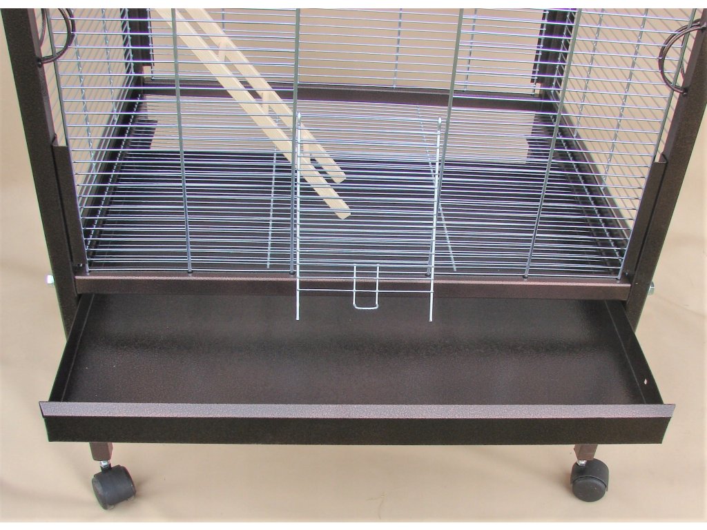 Klietka má výsuvnú zásuvku pre ľahké a rýchle čistenie klietky a kolieska pre ľahký pohyb klietky.