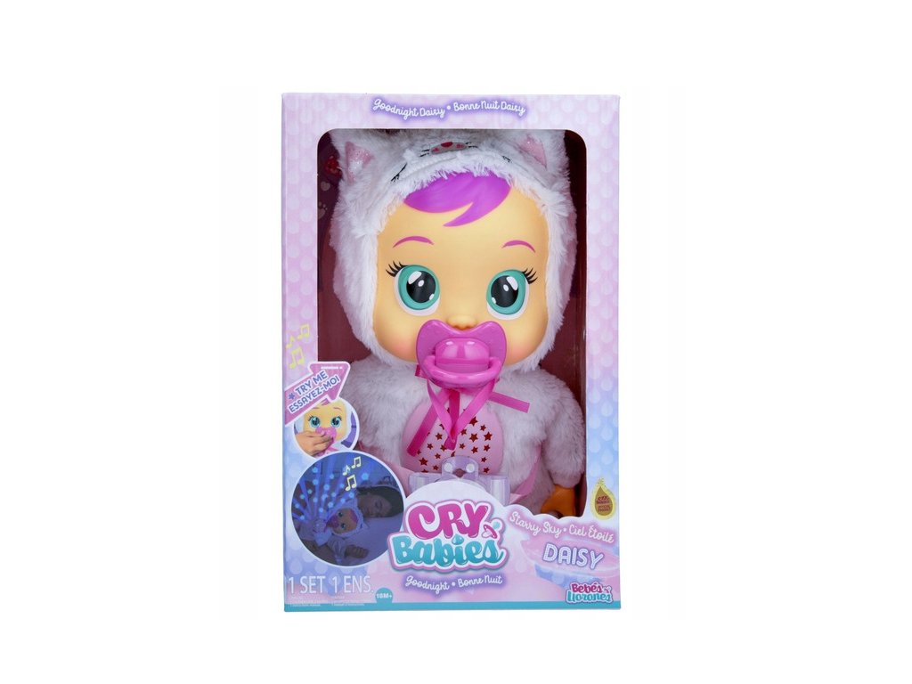 Zoznámte sa s bábikou Cry Babies Goodnight Starry Sky Daisy! Je to mäkký, prítulný a sladký spoločník na spanie. Bábika plače žiariacimi slzami a bez cumlíka vydáva autentické zvuky plačúceho bábätka. Dajte jej cumlík znova, aby prestala plakať! Hračka vydáva 8 rôznych zvukov. Navyše, keď sa vaše dieťatko bude tlačiť na bruško, Daisy premení jeho spálňu na magickú, hviezdnu nočnú oblohu a bude hrať 5 rôznych uspávaniek až 10 minút! Daisy má na sebe trblietavé pyžamo a zodpovedajúci cumlík. Nedá sa prať.