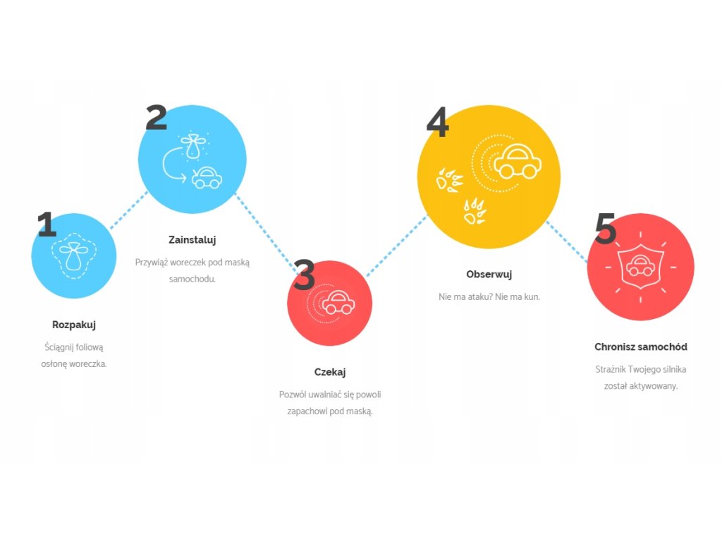 Woreczek wypakować z folii i podwiesić za pomocą sznureczków pod maską samochodu (1-2 szt.) lub na poddaszu (2-4 szt.)., w miejscu bezpiecznym i niedostępnym dla innych zwierząt oraz dzieci.