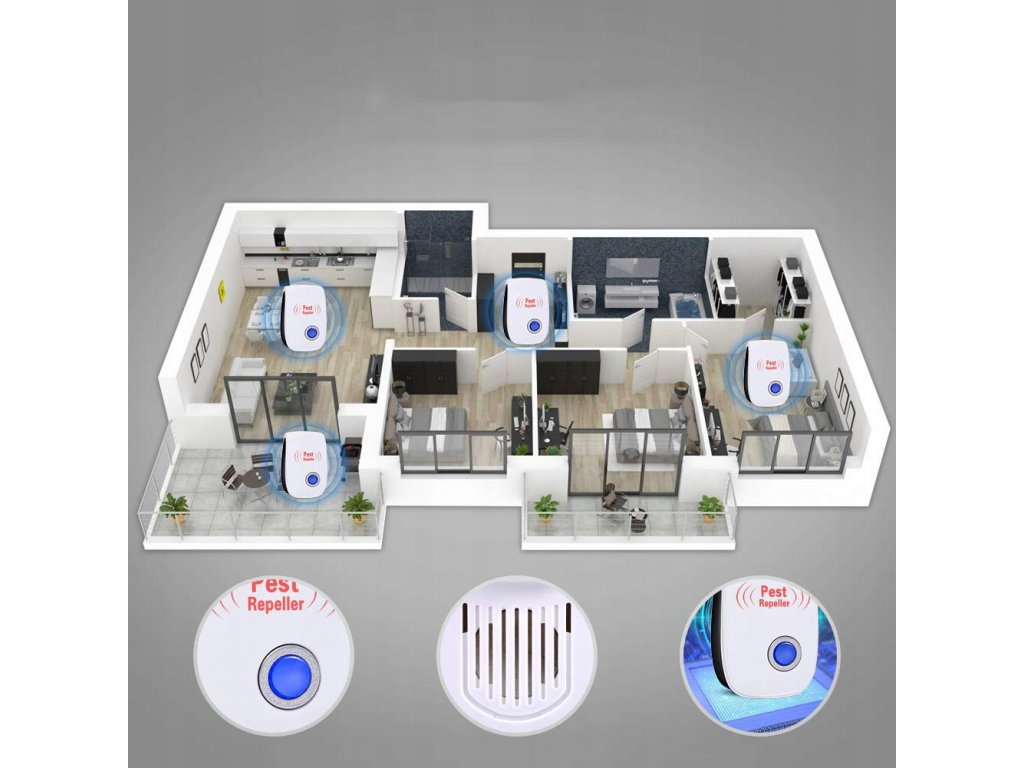 Duży obszar pokrycia: Każdy odstraszacz ultradźwiękowy odrzutu szkodników może obejmować obszar do 60 metrów kwadratowych. Aby osiągnąć najlepsze wyniki, zaleca się, aby jedna jednostka na każde pomieszczenie była zakryta i chroniona w każdym zakątku domu.