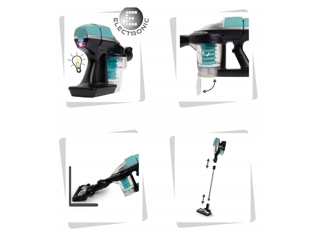 Tento vysávač tiež napodobňuje zvuk skutočného vysávača, vďaka čomu je hranie s ním ešte realistickejšie. Na výber sú tri verzie, vysávač je možné použiť ako podlahový vysávač, ručný vysávač alebo ručný vysávač s podlahovou hubicou. Hračka má pohodlnú rukoväť a svetlá, vďaka ktorým je hranie s vysávačom pre deti pohodlné.