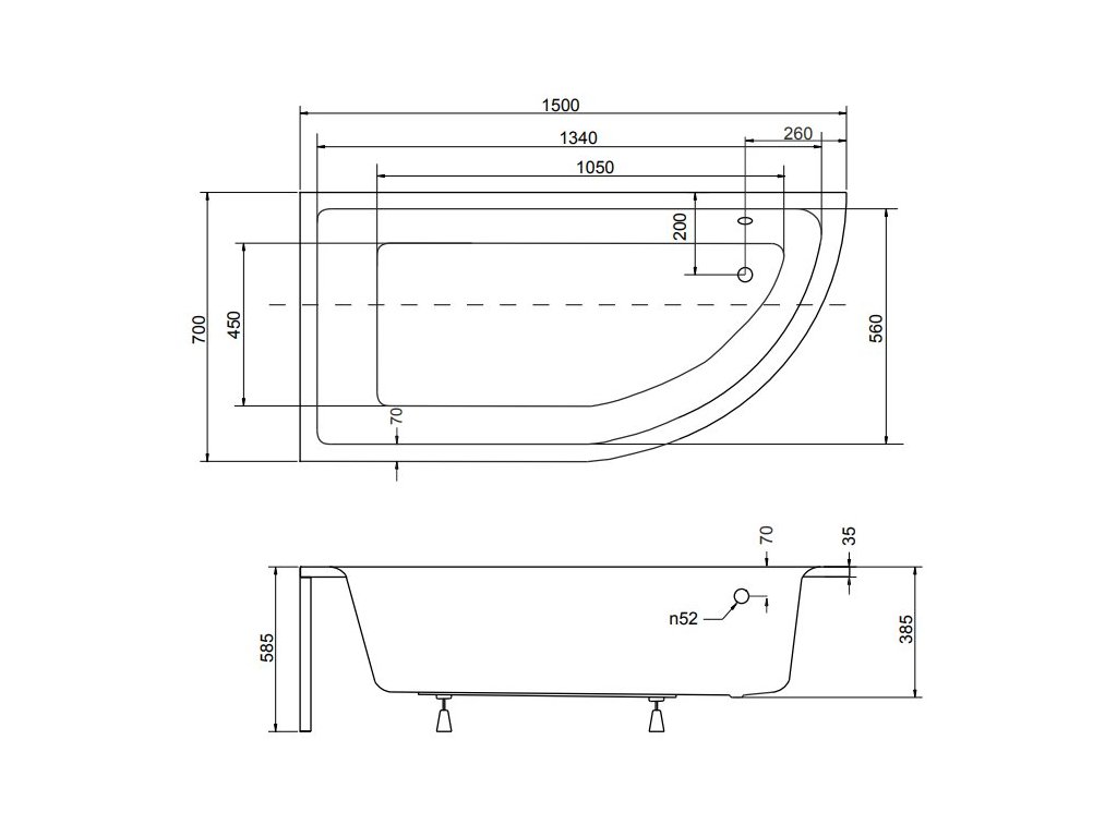 Technický nákres zobrazuje ľavú vaňu, pravá vaňa jej zrkadlový obraz.
