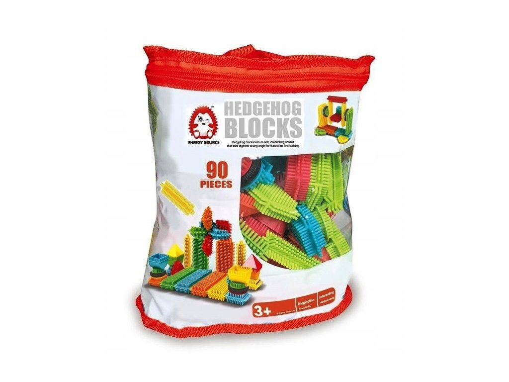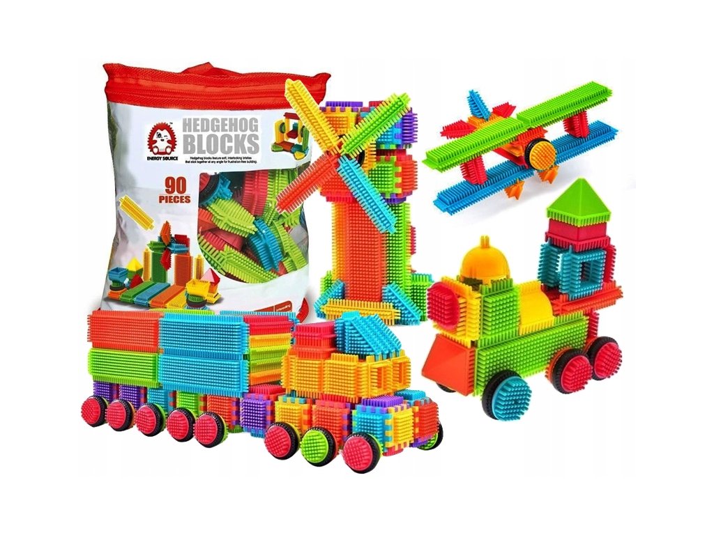 • W zestawie znajduję się 90 klocków o różnych kształtach, w 4 barwnych kolorach. W komplecie do klocków dołączona jest również książeczka z pomysłami konstrukcyjnymi. Z takich klocków dziecko zbuduje między innymi: samochód, łódkę, wiatrak. Cały zestaw klocków zapakowany jest w torbę, która zapinana jest na zamek. Dzięki czemu po skończonej zabawie wszystkie elementy trafią na swoje miejsce. ( niektóre przedstawione budowle zostały wykonane z kilku zestawów klocków)