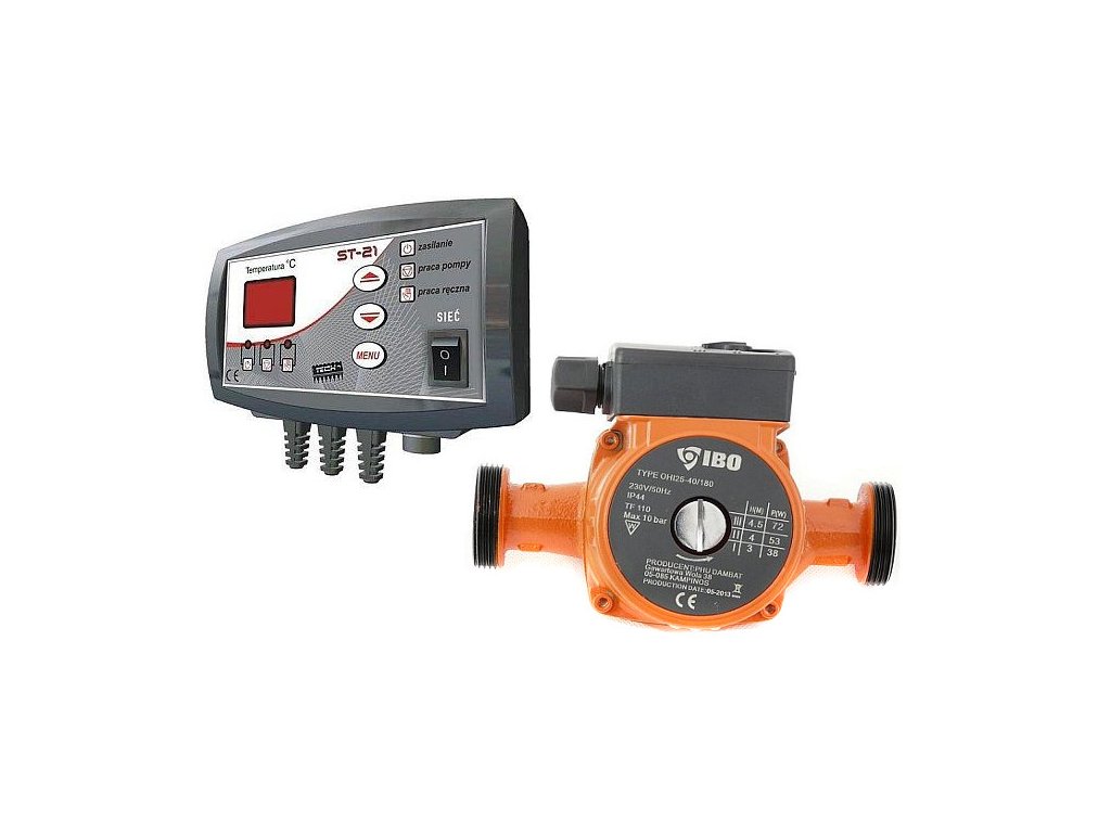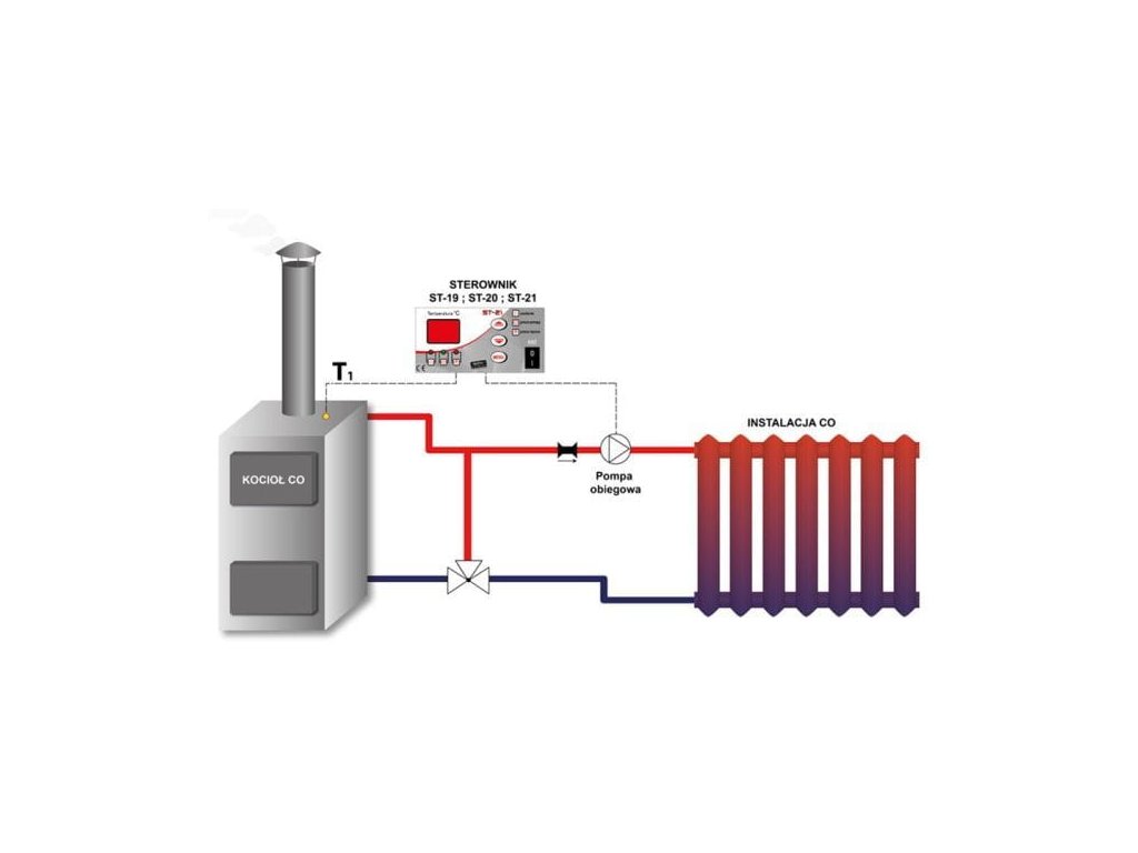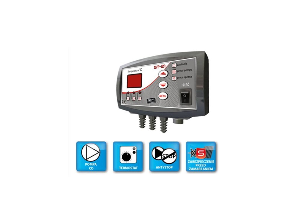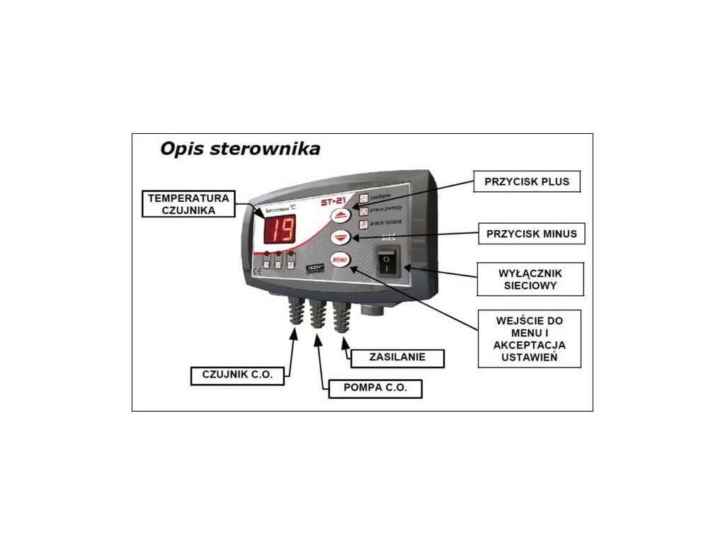 Regulator ST-21 z wyświetlaczem LED przeznaczony jest do sterowania pompą obiegu wody centralnego ogrzewania. Zadaniem regulatora jest załączanie pompy, gdy temperatura uzyska zadaną wartość oraz wyłączanie jej - jeśli kocioł wychłodzi się poniżej zadanej o wartość ustawionej histerezy. Taki tryb pracy zapobiega niepotrzebnemu działaniu pompy, co pozwala zaoszczędzić energię elektryczną jak również przedłuża żywotność pompy i podnosi jej niezawodność. Regulator ST-21 może równiez pełnić funkcję termostatu wyłączając pompę po osiągnięciu temperatury zadanej. Sterownik posiada również funkcję ANTYSTOP, która zapobiega zastaniu pompy obiegowej poza sezonem (pompa załącza sie co ok. 10 dni na 1 minutę). Dodatkowym zabezpieczeniem jest funkcja antyzamarzanie, która przeciwdziała zamarzaniu wody w instalacji, gdy temperatura spadnie poniżej 6°C pompa załączy się na stałe).