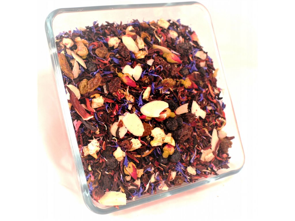 Świetnie skomponowana mieszanka w skład której wchodzą migdały, aronia, rodzynki, pączki oraz skórka róży, jabłko, bławatek i oczywiście hibiskus. Bogaty zestaw witamin wzmacniający odporność i witalność organizmu. Ekscytująca i orzeźwiająca o słodkim, intensywnym aromacie.