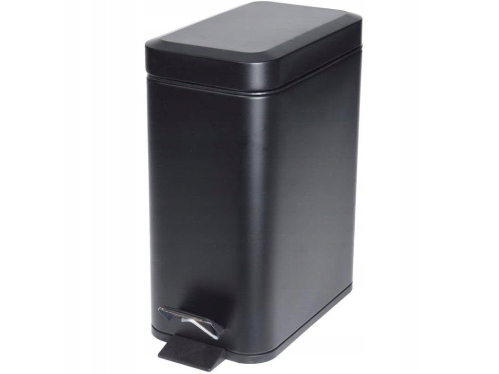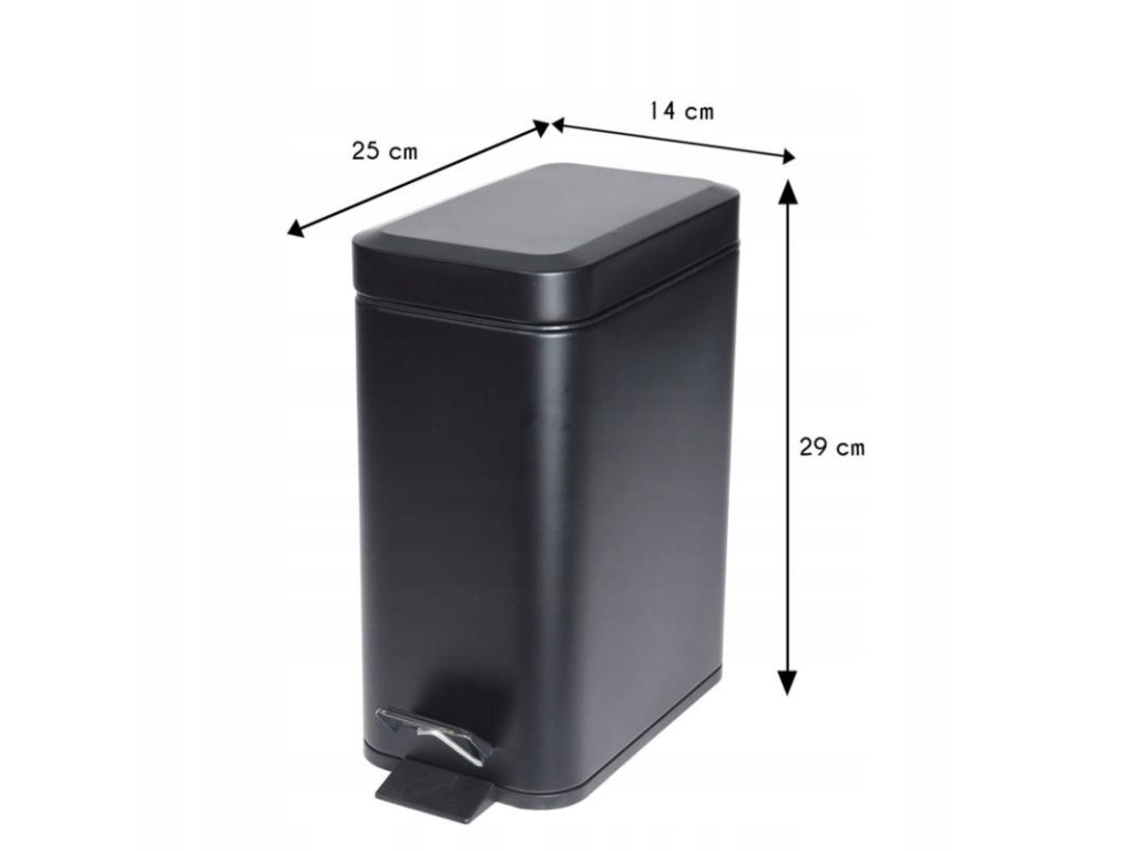 Prostokątny, elegancki pojemnik na śmieci w nowoczesnym designie. Wykonany z wysokiej jakości metalu. Kosz wyposażony w pedał nożny i w otwieraną od góry pokrywę. Pokrywa samo zamykająca zabezpiecza przed wydostawaniem się nieprzyjemnego zapachu. W środku kosza znajduje się wyjmowane plastikowe wiaderko, co ułatwia opróżnianie kosza. Pojemnik idealnie nadaje się do łazienki, kuchni, biura czy innego pomieszczenia.