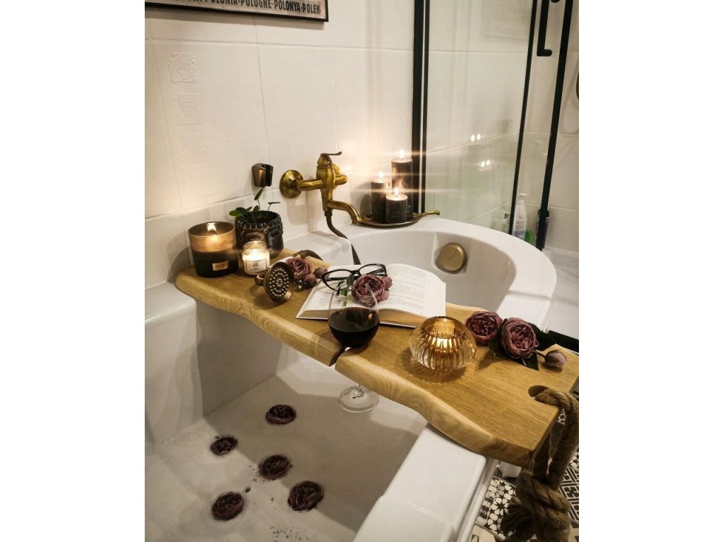 Natura to najwspanialszy artysta. Deska na wannę z miejscem na kieliszek, świeczniki i sznur stworzy niepowtarzalny klimat w Twojej łazience.