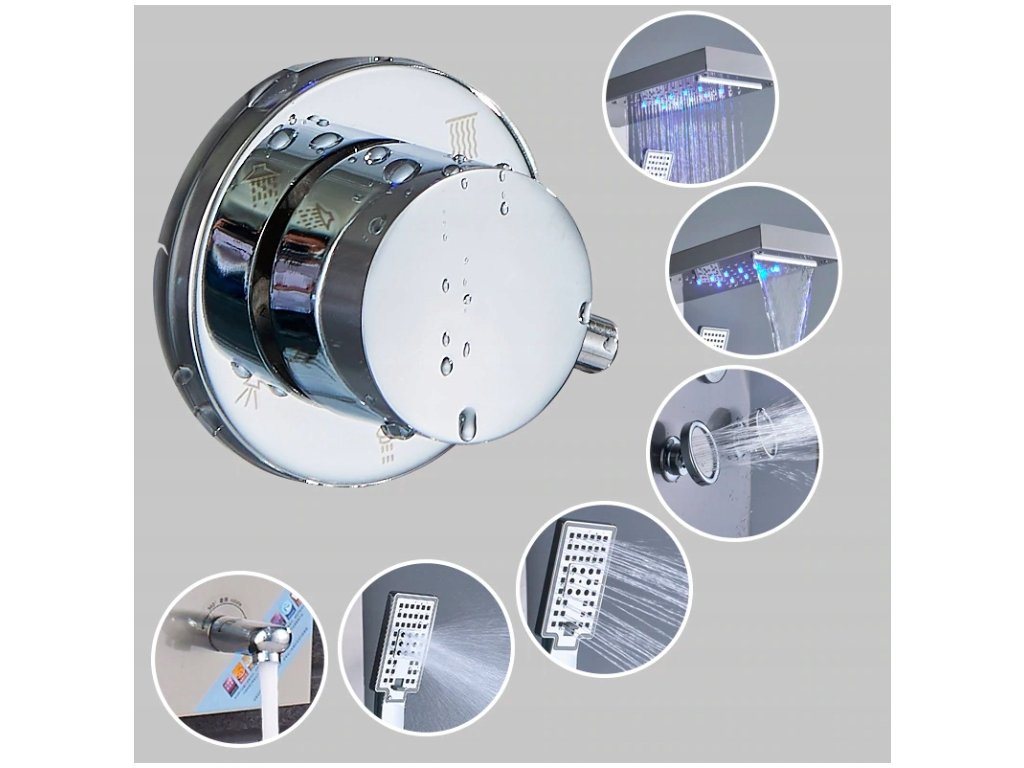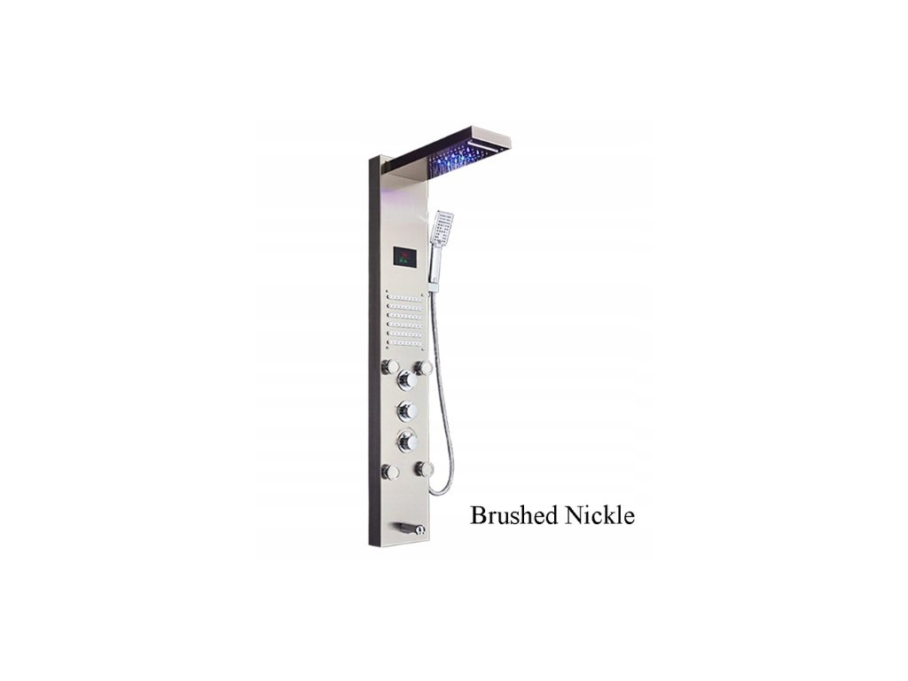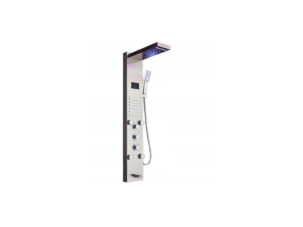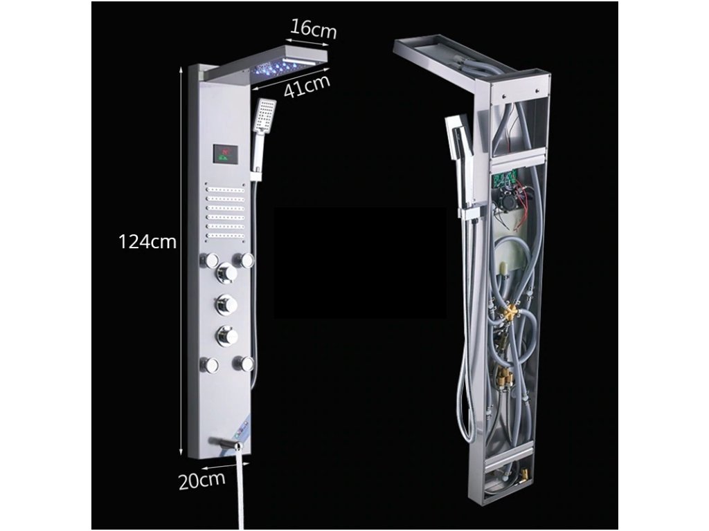 Krásny a moderný digitálny multifunkčný sprchový panel so zabudovaným LED osvetlením. Ak chcete dokončiť sprchový panel obsahuje najvyššej kvality z nerezovej ocele, mosadze a vysoko kvalitný materiál, ktorý je veľmi ľahko čistiť. Panel s dažďovou sprchou a vaňou je pripravené na montáž po obdržaní. Sada obsahuje všetko, čo je nutné použiť panel. Panel je vybavený systémom ventilov, ktorý umožňuje presnú kontrolu ako sily a teploty prúdu, rovnako ako spôsob, ktorý má prúdiť von. Panel vyzerá veľmi elegantne a exkluzívne. To dokonale zapadá do prostredia a ovplyvňuje vzhľad celej kúpeľne. Sprchový panel s dažďovou sprchou vám poskytne skvelý zážitok na mnoho rokov.