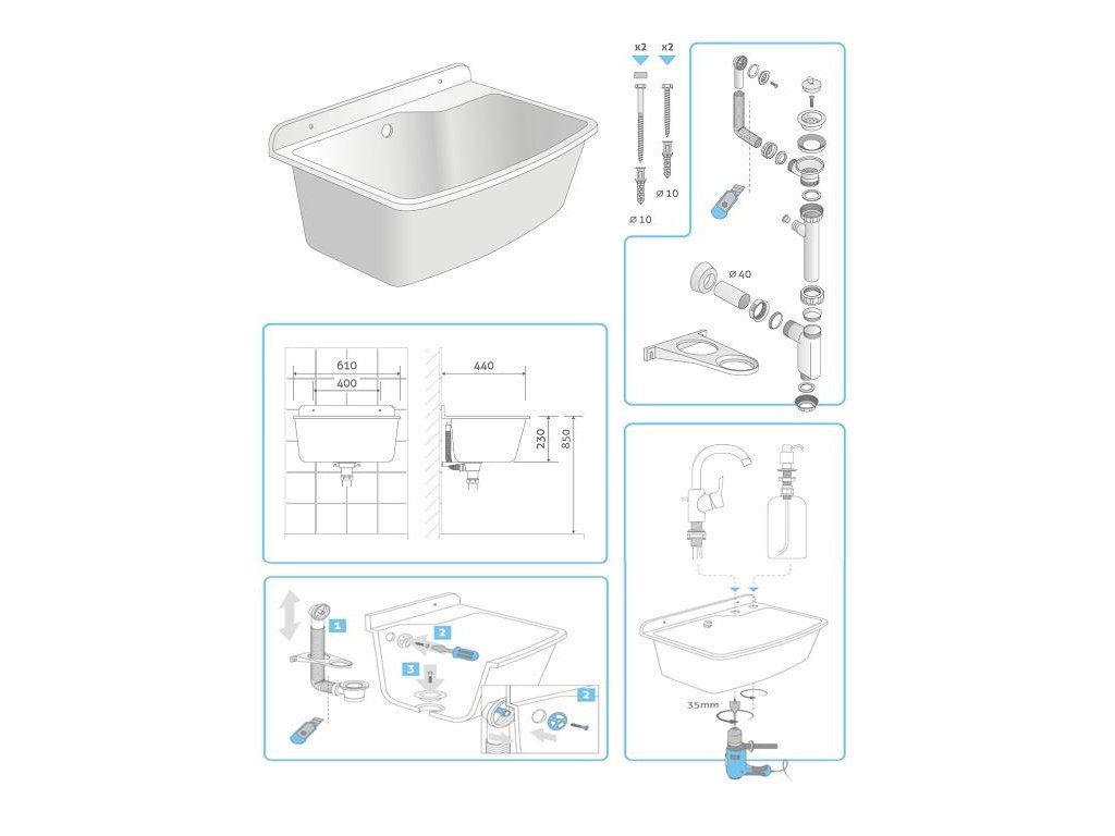 Sprzedawany zestaw przygotowany do montażu w ścianie. Zlew posiada już wywiercone dziury do zamontowania baterii i dozownika.