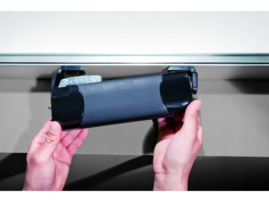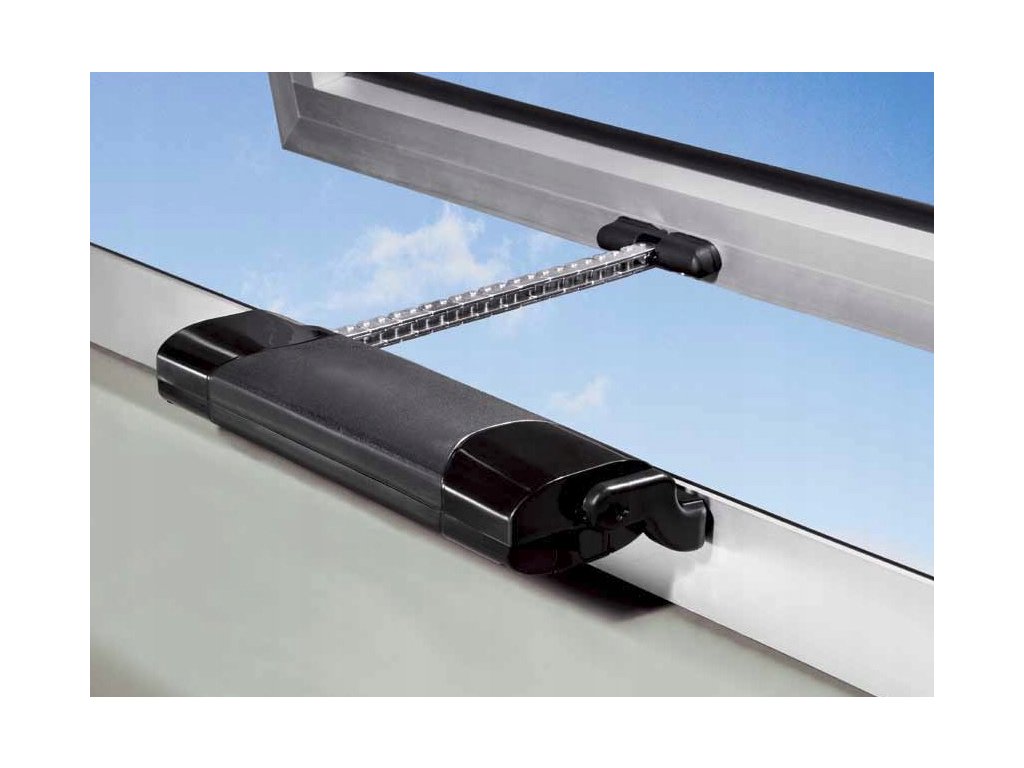 Siłownik dostępny jest w kolorze białym (na zdjęciach kolor czarny pokazany tylko poglądowo). Konsola montażowa siłownika jest również biała (w kpl. do okna uchylnego do wewnątrz lub na zewnątrz).