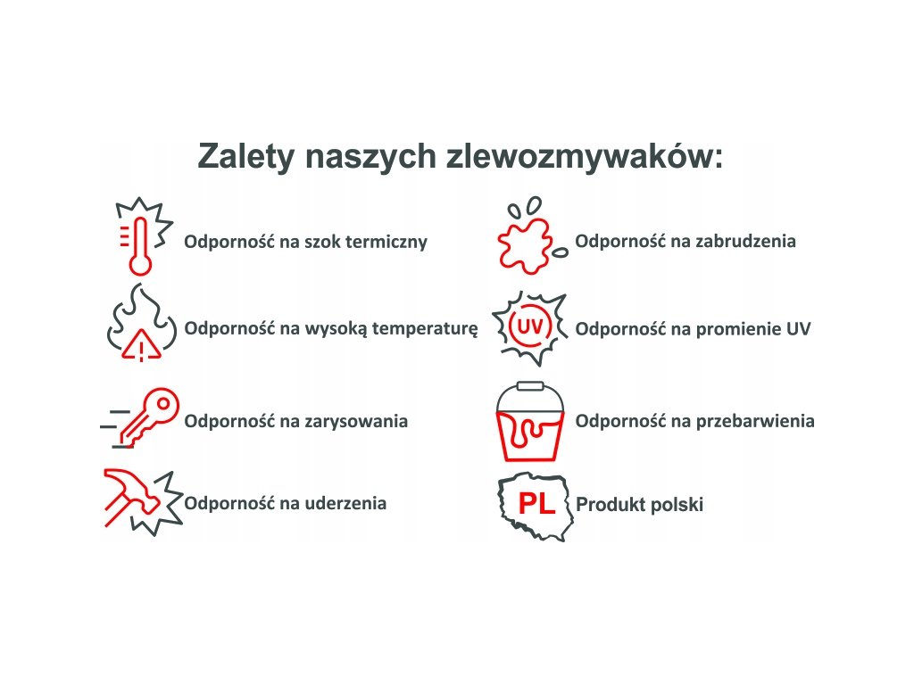 • Dodatkowo w zestawie: karta gwarancyjna, szablon wycięcia otworu pod montaż zlewozmywaka