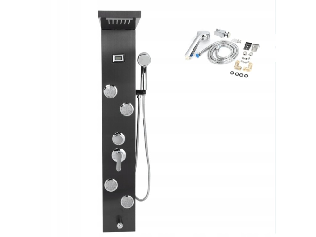 1 x panel jednostki głównej sterowania 1 x górny panel prysznicowy 1 x wąż 150 cm 2 x zestaw akcesoriów śrubowych 1 x ręczna głowica prysznicowa 1 x wspornik głowicy prysznicowej 2 x adapter 4 x filtr 1 x instrukcja obsługi