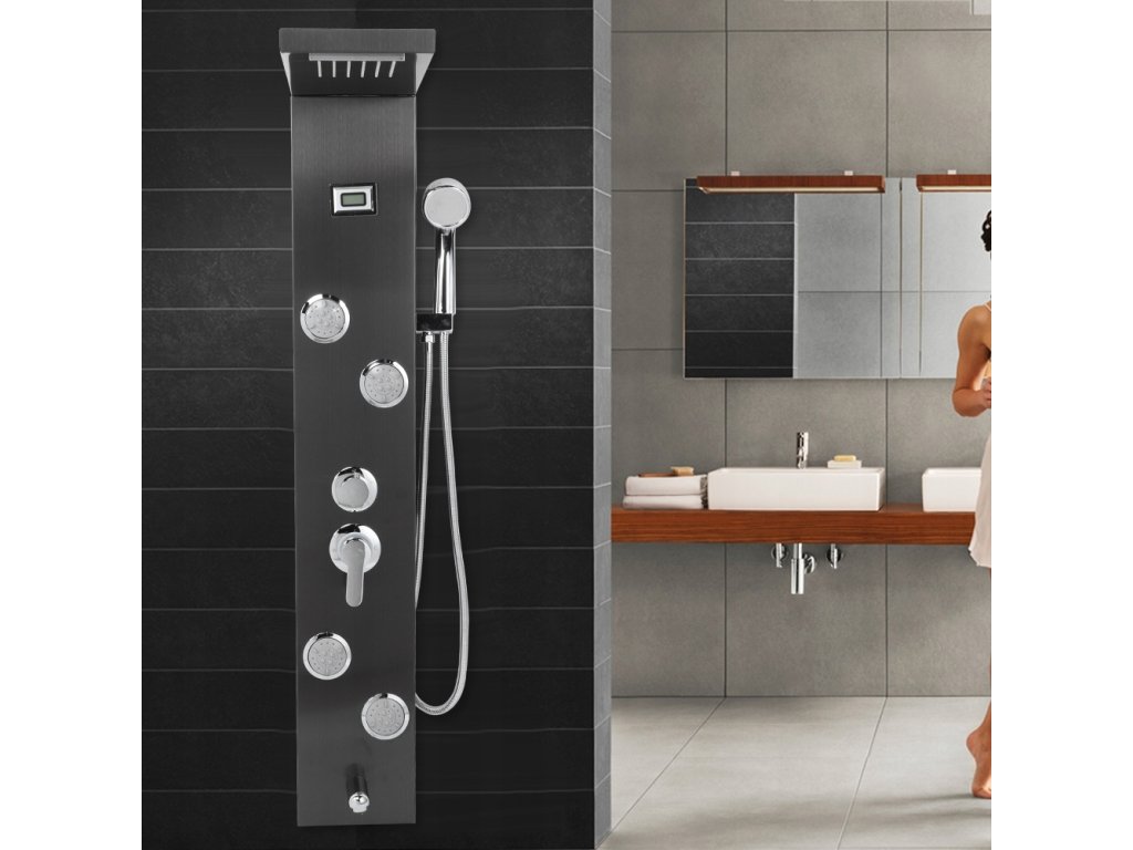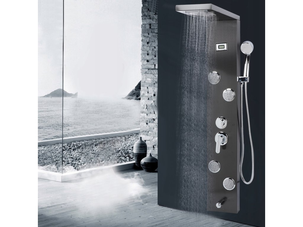 1. Panel natryskowy ma głowicę prysznicową z wodospadem deszczowym, dyszę wodną, ​​wielofunkcyjną słuchawkę prysznicową z trzema stałymi uchwytami i głowicę natryskową.