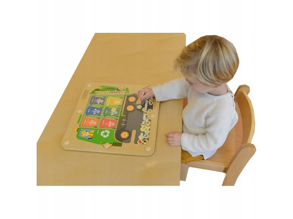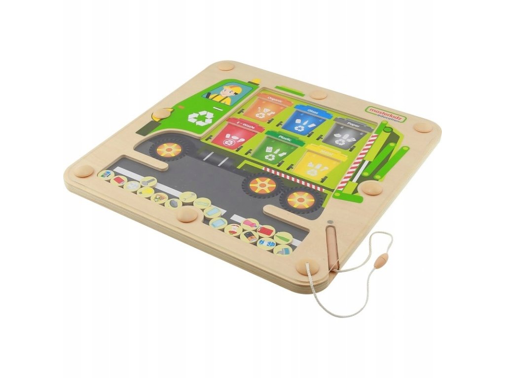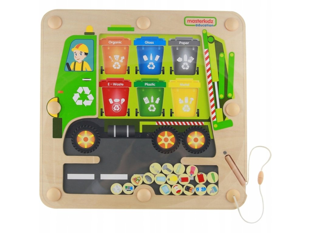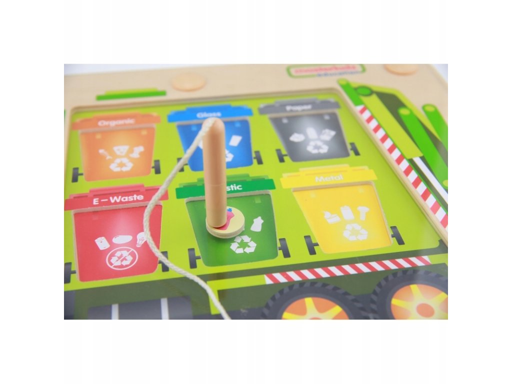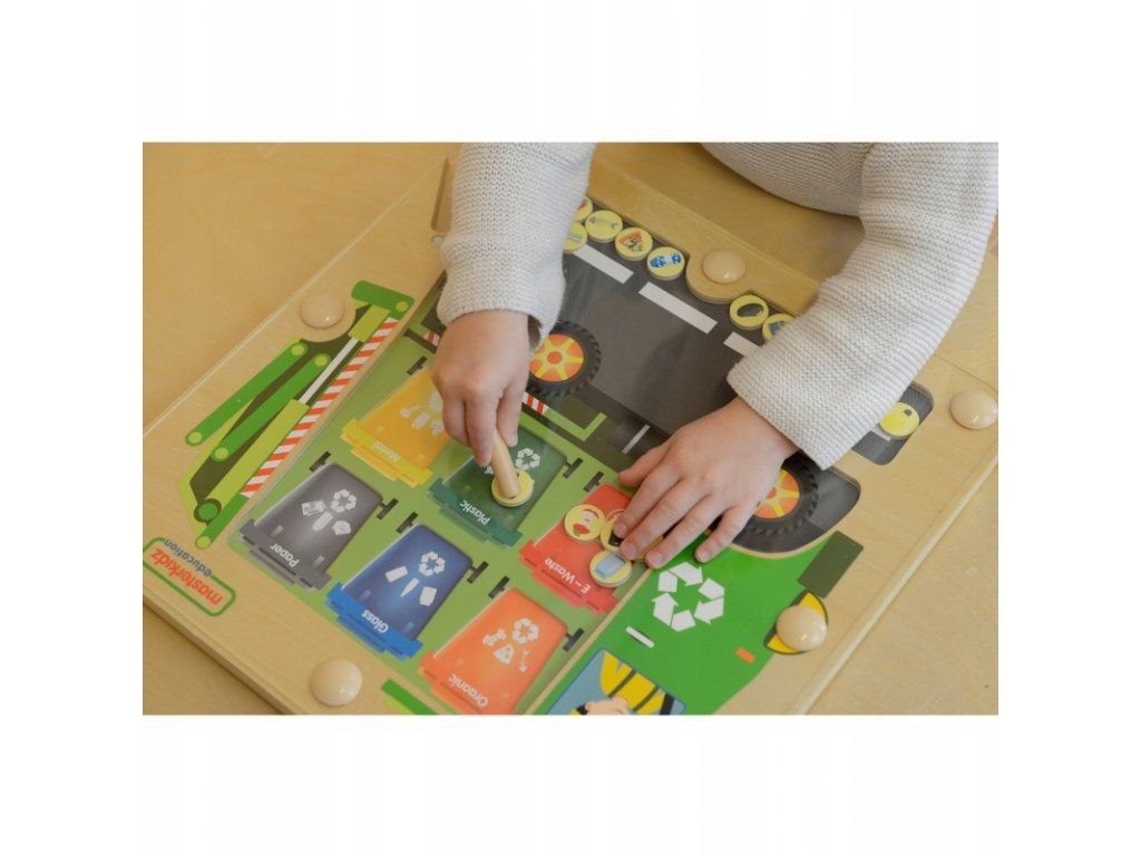 Zadaniem dziecka jest użycie magnetycznej pałeczki, by przenieść śmieci do właściwych kubłów w śmieciarce. Śmieci to oczywiście okrągłe żetony, które tylko czekają na to, by wyrzucić je w odpowiednie miejsce. Z pomocą opiekuna, lub rodzica, dziecko zrozumie na czym polega recykling i dlaczego segregowanie śmieci jest tak ważne. Nauczą się również jakiego rodzaju śmieci należy wyrzucać do którego kubła.