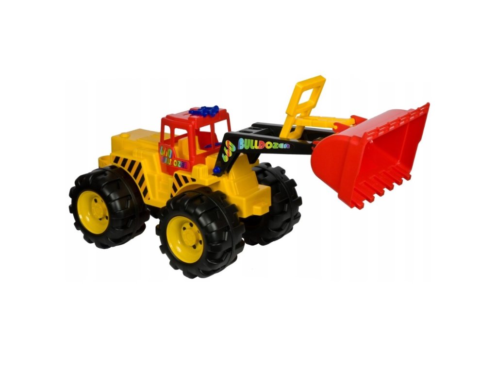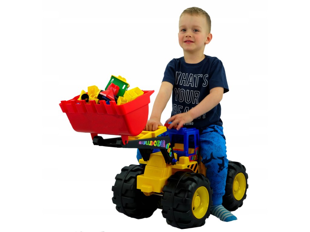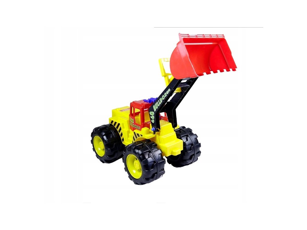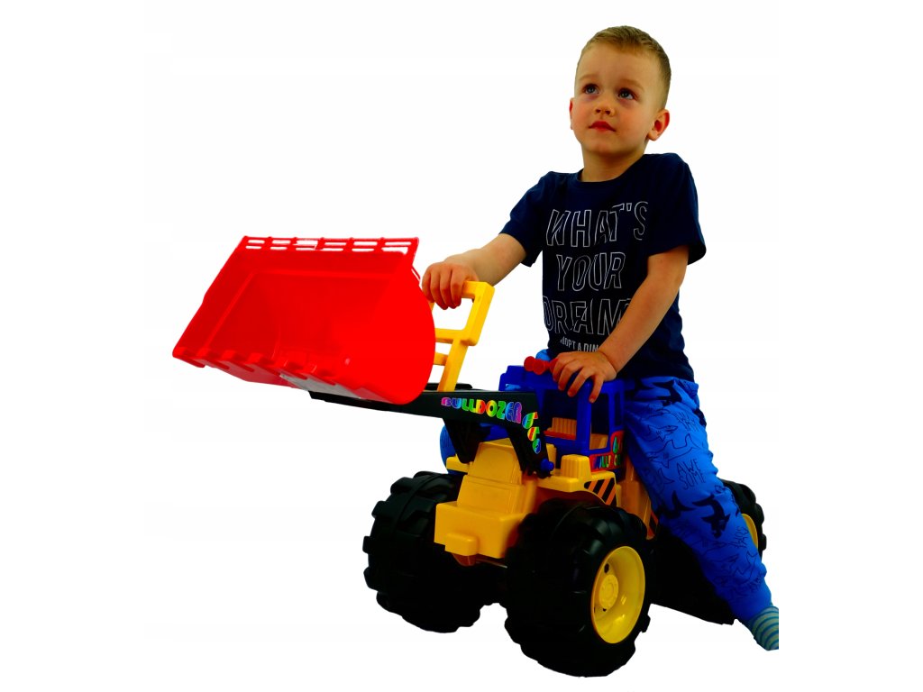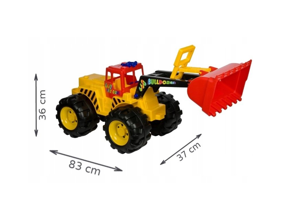 Buldożer wymiarowo pozwala na operowanie małemu kierowcy siedząc na zabawce. Dziecko może odpychając się nogami swobodnie się przemieszczać. Duże i szerokie koła zapewniają dobrą stabilizację użytkownikowi, poruszanie się po piasku i trudnym terenie nie stanowi większego problemu. Połączenie elementów plastikowych z częściami metalowymi stanowi trwałą i stabilną konstrukcję.