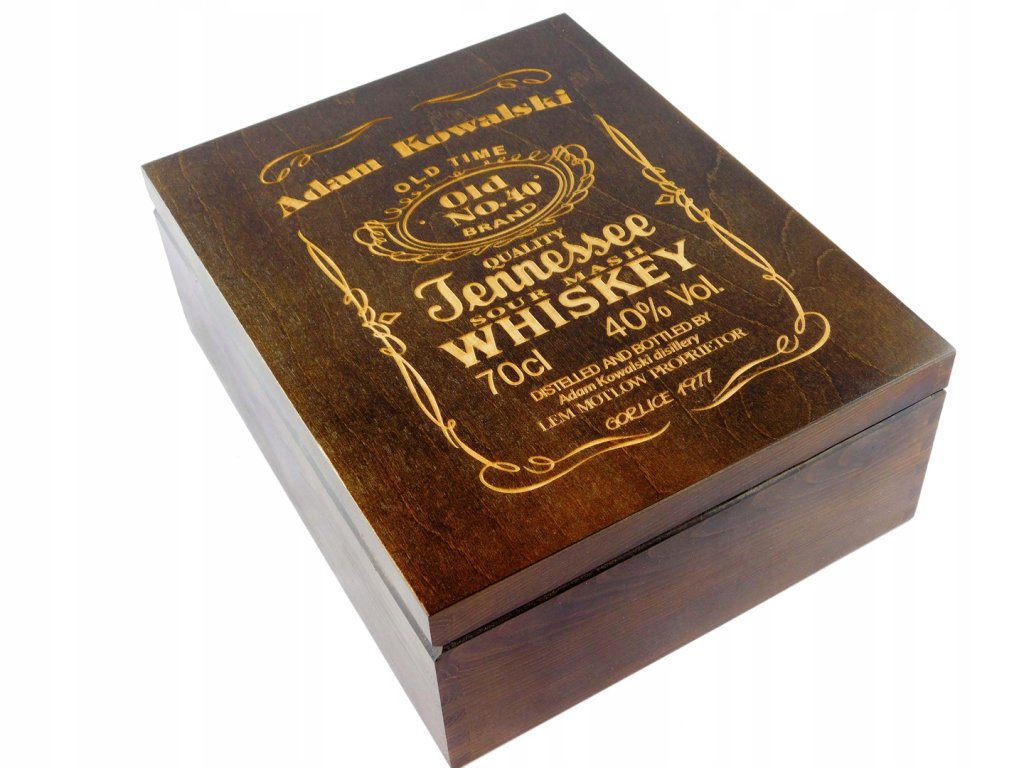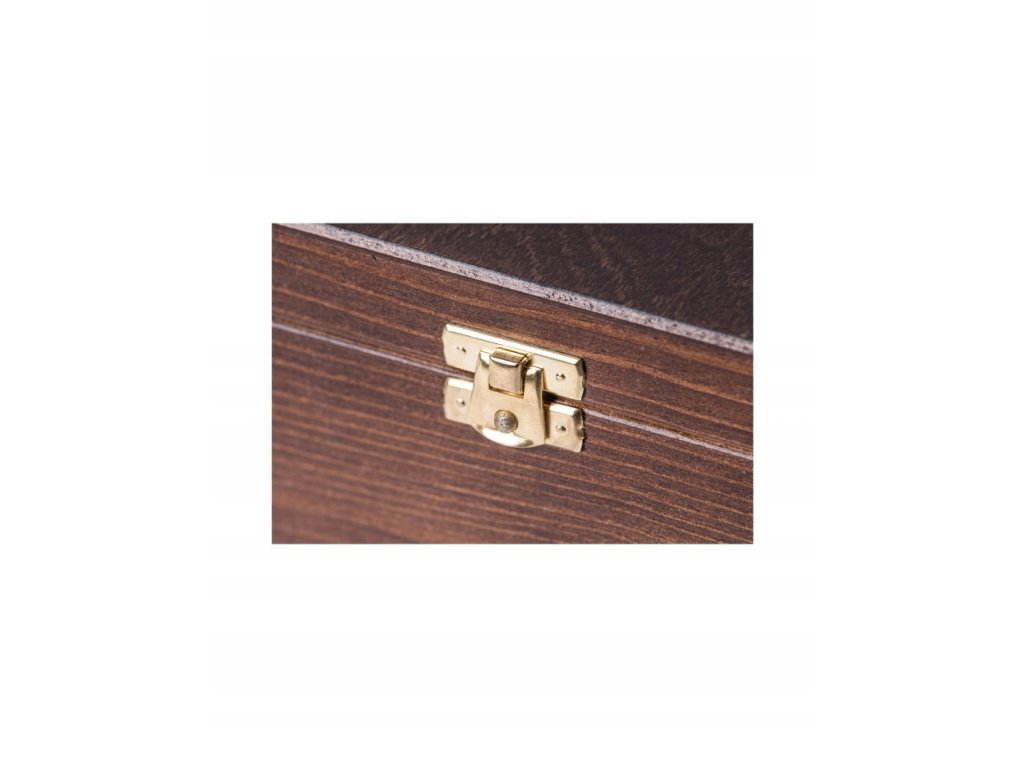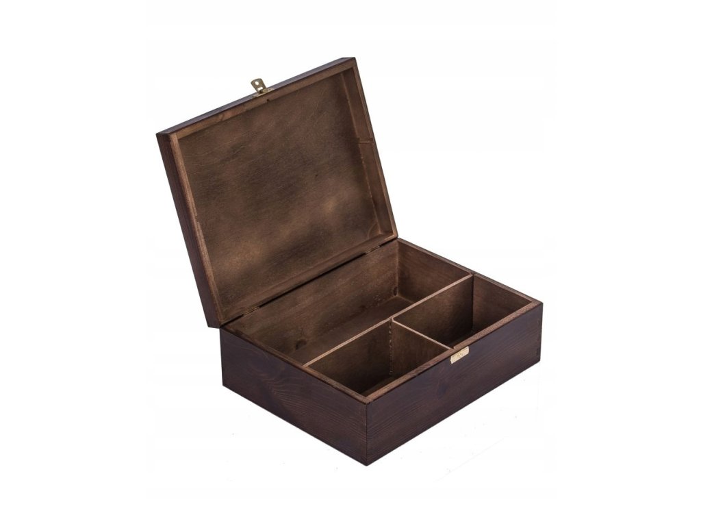 • skrzynka drewniana w kolorze ciemno brązowym z grawerowanym wieczkiem