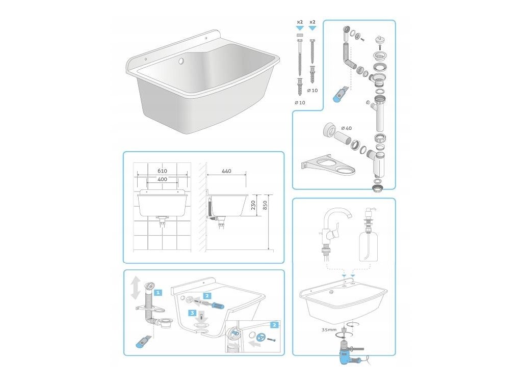 Sprzedawany zestaw przygotowany do montażu na ścianie lub w blacie.