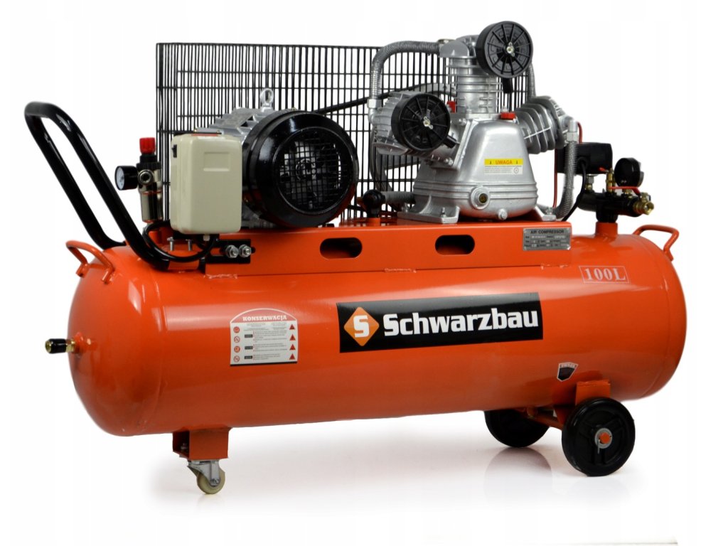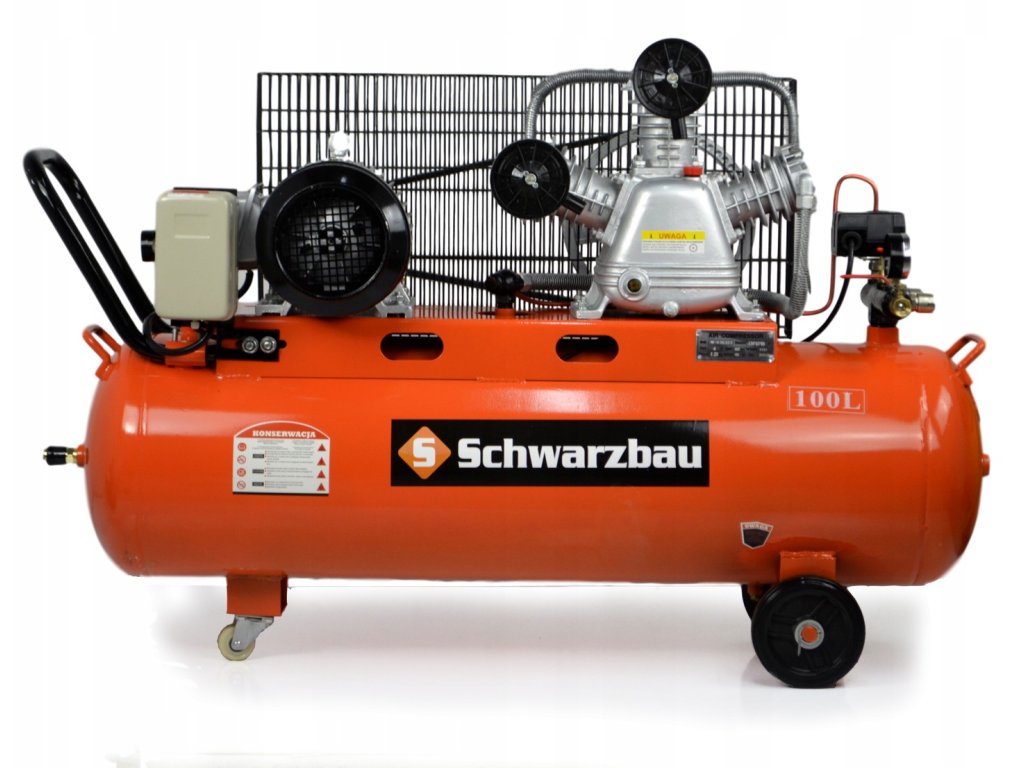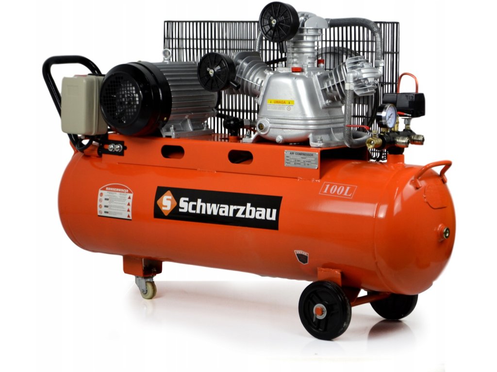 Kompresor olejowy 100L renomowanej firmy Schwarzbau. Duża moc wydajność sprawia iż model ten sprawdzi się idealnie w każdym warsztacie. Może napędzać różnego rodzaju narzędzia pneumatyczne, służyć do malowania natryskowego, piaskowania, pompowania kół oraz znajdować inne zastosowania.