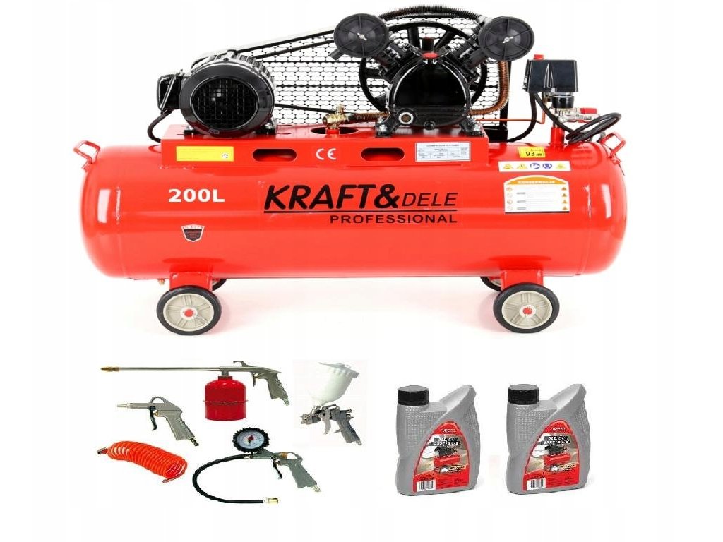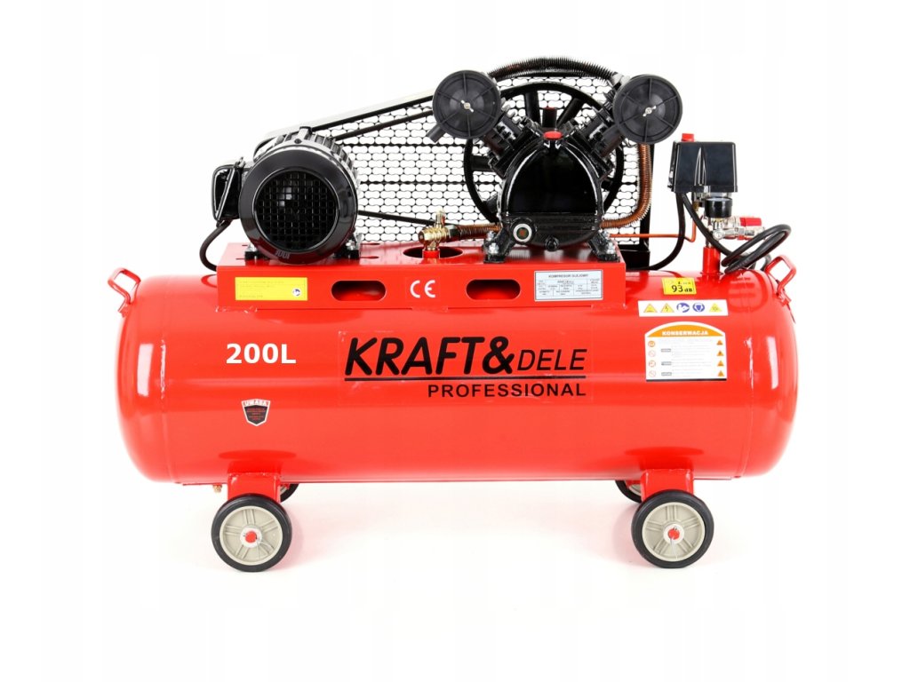 Firmowy kompresor olejowy niemieckiej firmy KRAFT&DELE Professional o pojemności butli 200 litrów , wydajności 690l/min.