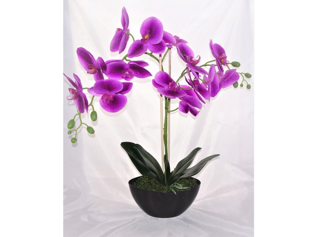 Przedmiotem aukcji jest fioletowy storczyk w czarnej donicy (pozostałe dekoracje nie stanowią przedmiotu sprzedaży).
