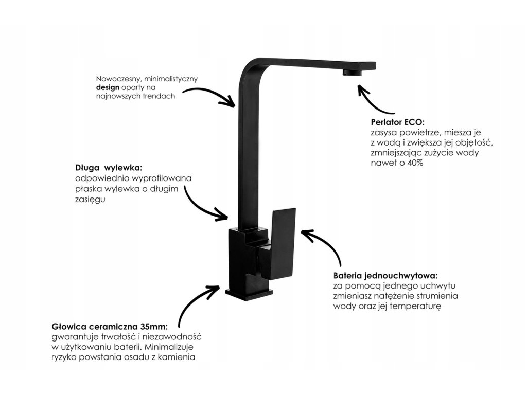 Praktyczna mechaniczna bateria zlewozmywakowa, jednouchwytowa, stojąca. Korpus wykonany jest z mosiądzu, głowica ceramiczna 35 mm. Posiada wyprofilowaną, płaską wylewkę. Napowietrzająca końcówka - perlator - ogranicza zużycie wody nawet o 40%. Zestaw zawiera 2 wysokiej jakości wężyki w oplocie ze stali nierdzewnej o długości 40 cm ze standardowym przyłączem 3/8 cala oraz komplet akcesoriów do montażu baterii. Design baterii został podporządkowany trendom na rok 2020 - prezentuje się niezwykle elegancko i idealnie pasuje do nowocześnie urządzonej kuchni.