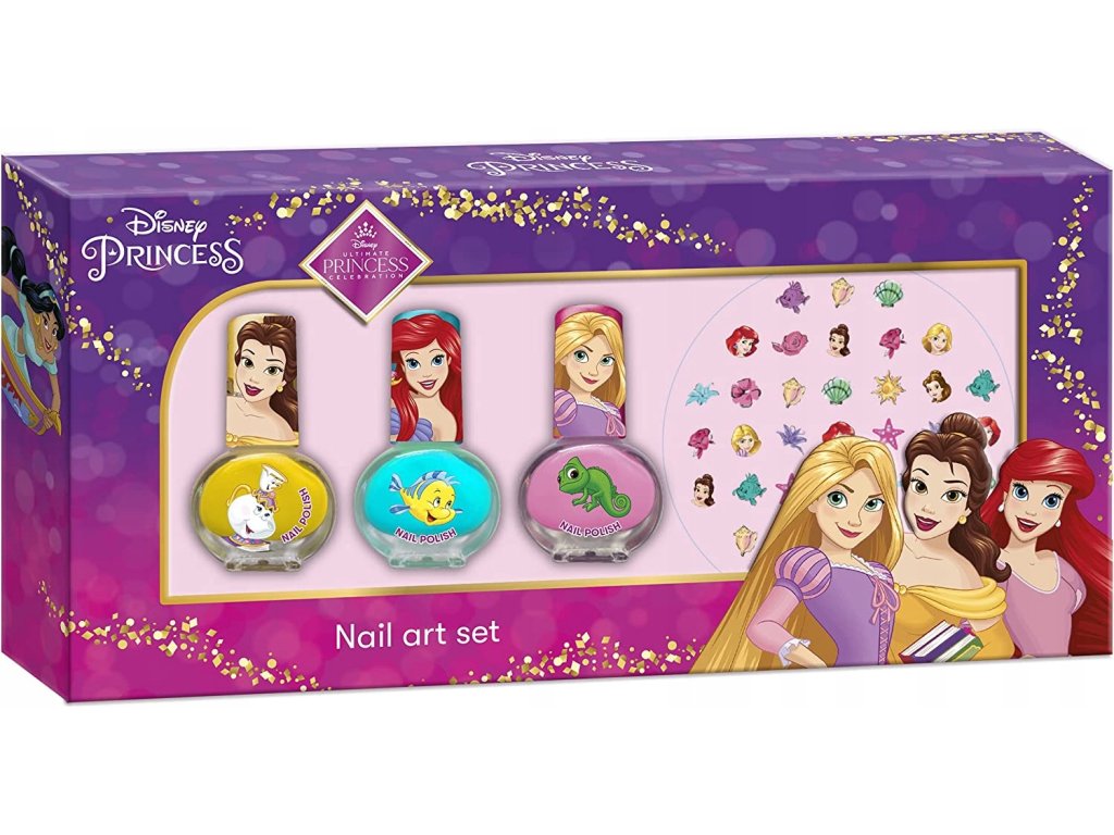 Sada na detskú manikúru, ktorá obsahuje 3 vodou riediteľné laky na nechty v ružovej, žltej a svetlomodrej farbe a tiež nálepky disney princeznej.
