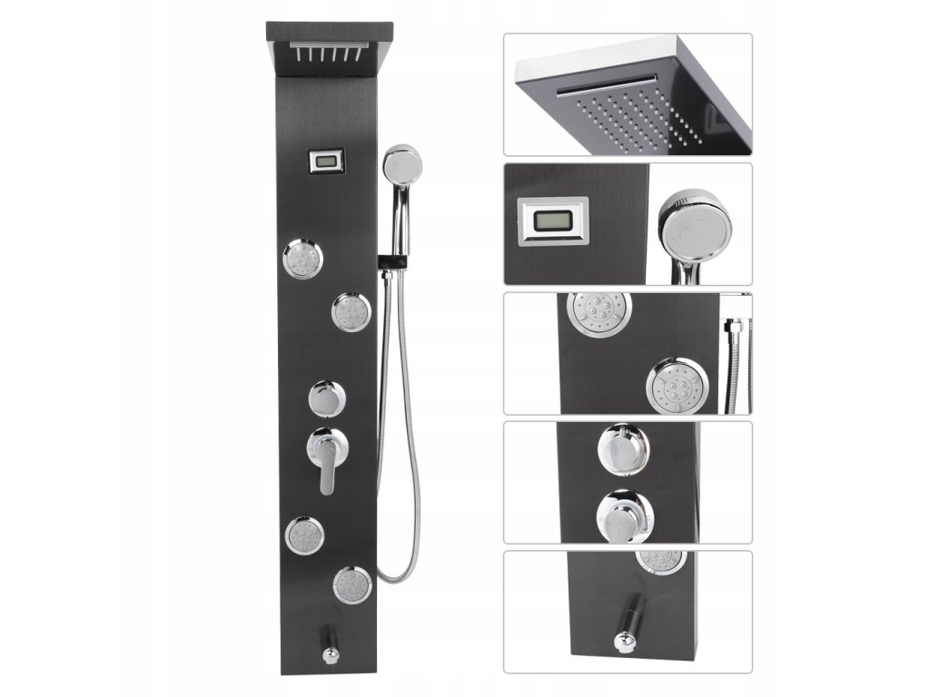 1. Panel natryskowy ma głowicę prysznicową z wodospadem deszczowym, dyszę wodną, ​​wielofunkcyjną słuchawkę prysznicową z trzema stałymi uchwytami i głowicę natryskową.