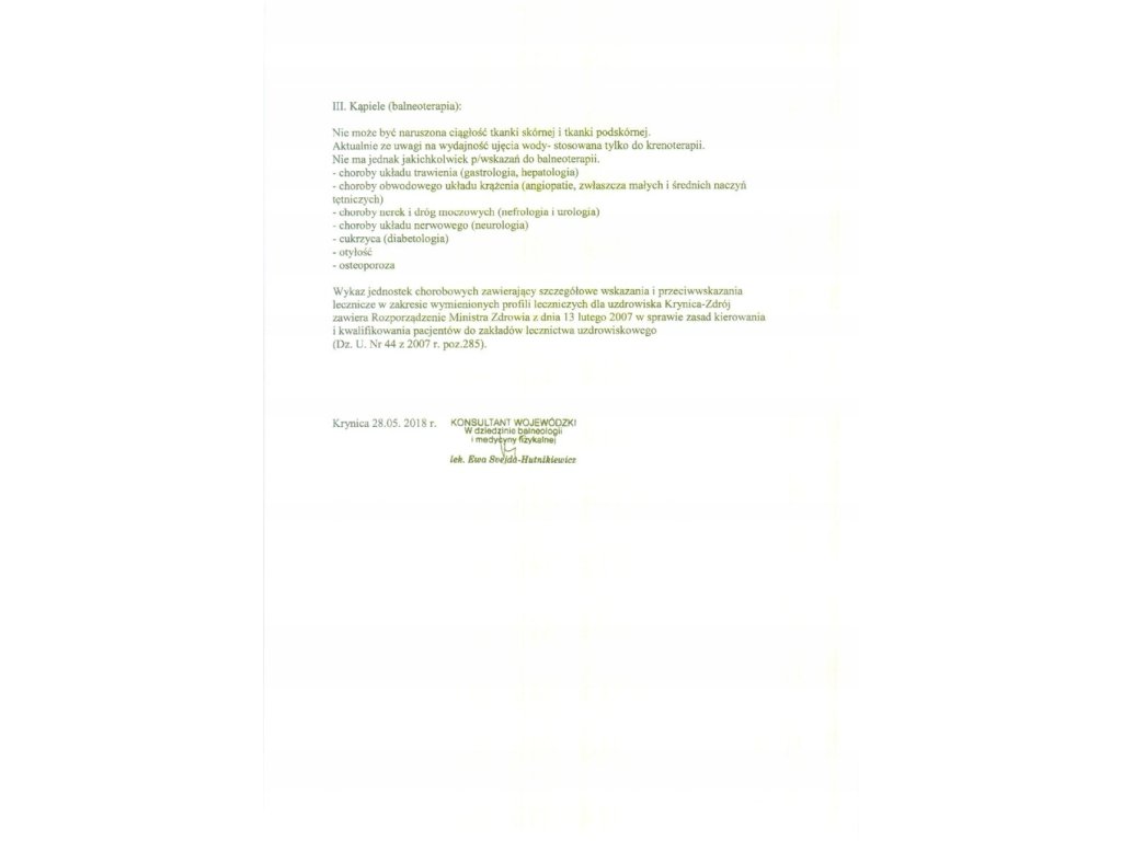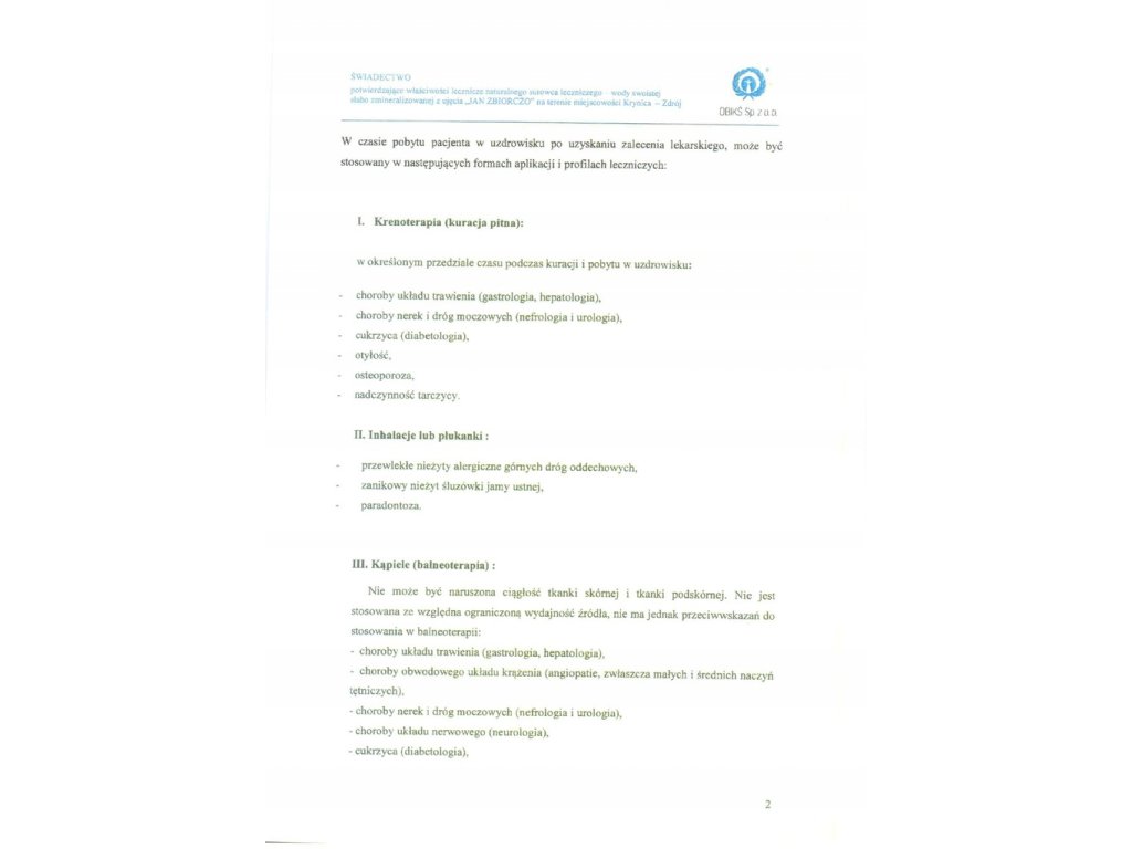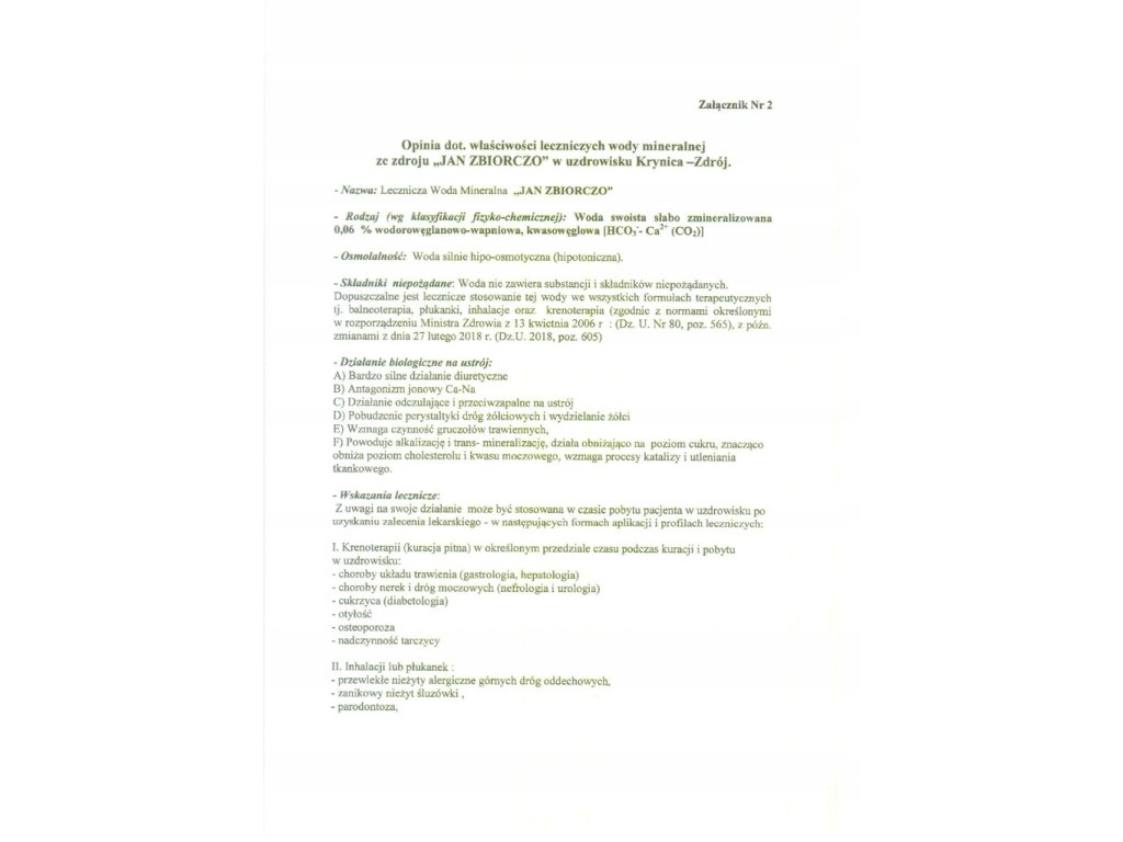 Doplňujúce informácie: Fyzikálno-chemická analýza bola vykonaná v akreditovanom laboratóriu. Má certifikát potvrdzujúci liečivé vlastnosti prírodnej liečivej suroviny. Fľašované z prameňa "Ján" v Krynici-Zdróji.