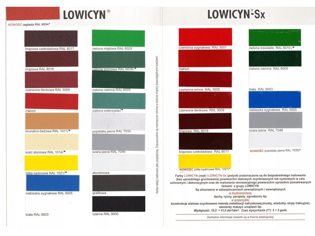 Lowicyn - jest gruntoemalią do bezpośredniego malowania powierzchni stalowych ocynkowanych w celu zabezpieczenia przed korozją i dekoracyjnym oraz do renowacji powierzchni uprzednio pomalowanych farbami z grupy Lowicyn.