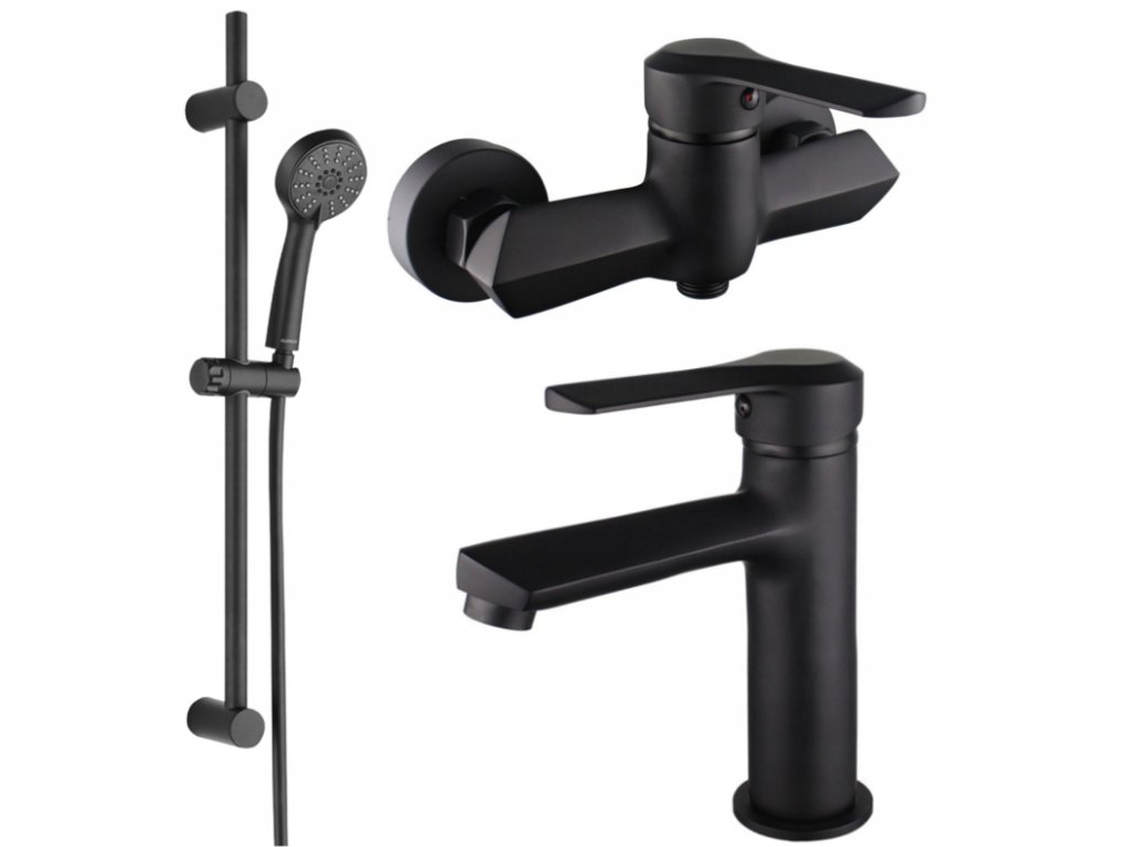 Komplet baterii Sabre – umywalkowa niska + prysznicowa ścienna z zestawem natryskowym