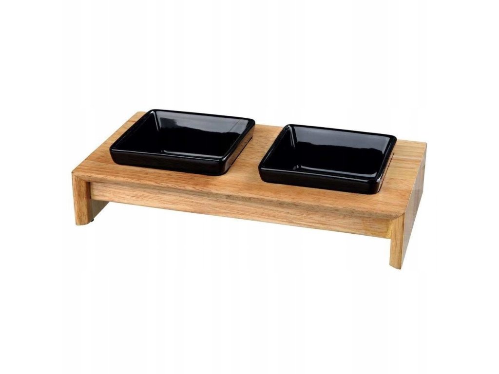 Eleganckie miseczki na drewnianym stojaku do podawania karmy i wody dla psa lub kota