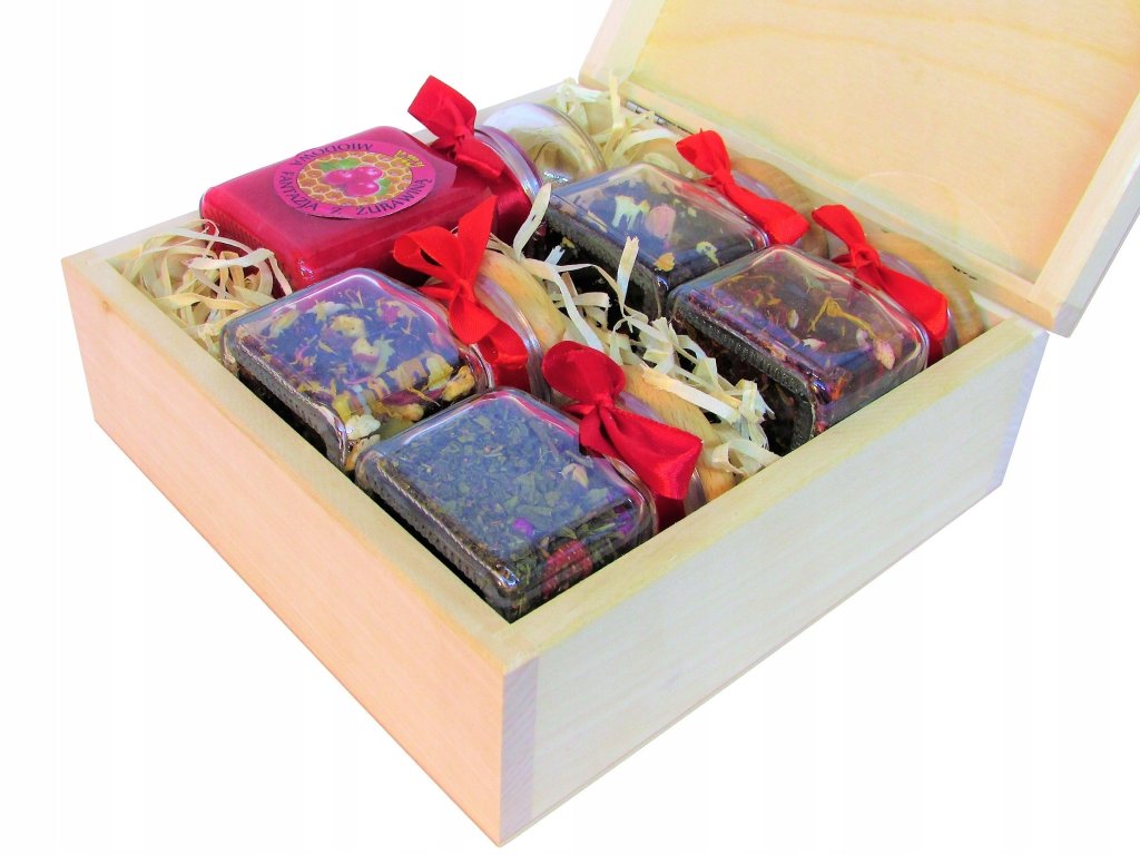 Zestaw zapakowany jest w drewniane pudełko z wstążką zawiązaną na kokardę. Na wieczku znajduje się drewniane serce z wygrawerowanym tekstem: Z OKAZJI IMIENIN!