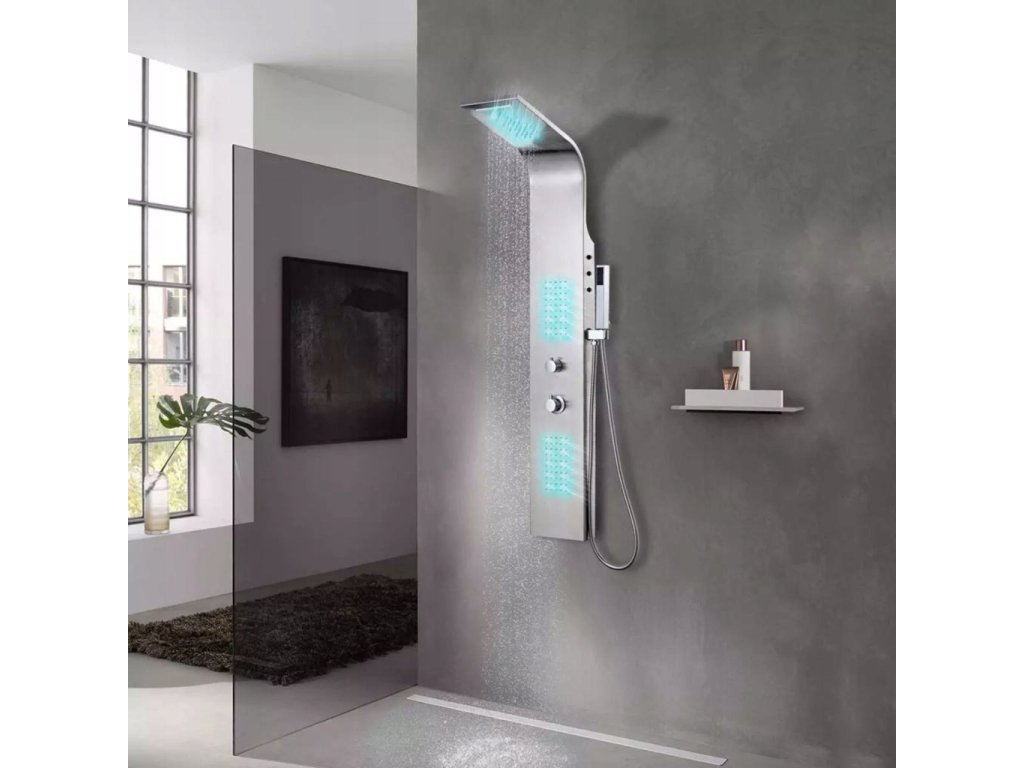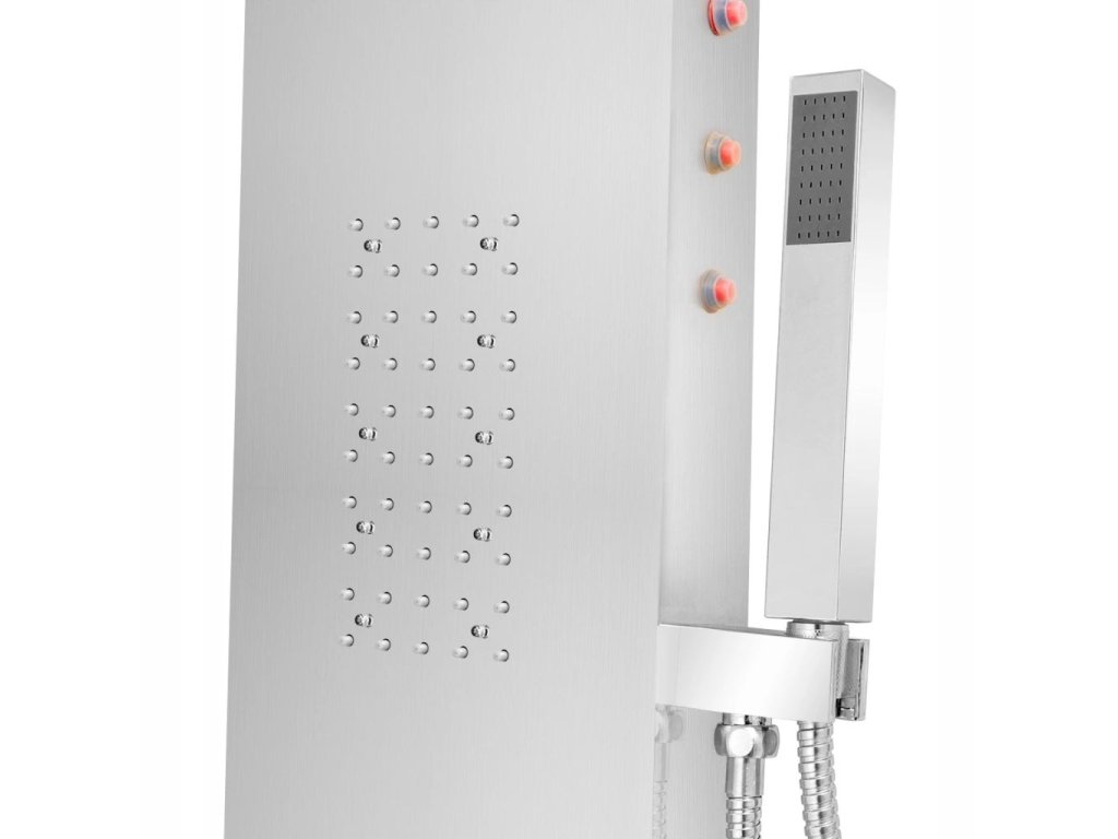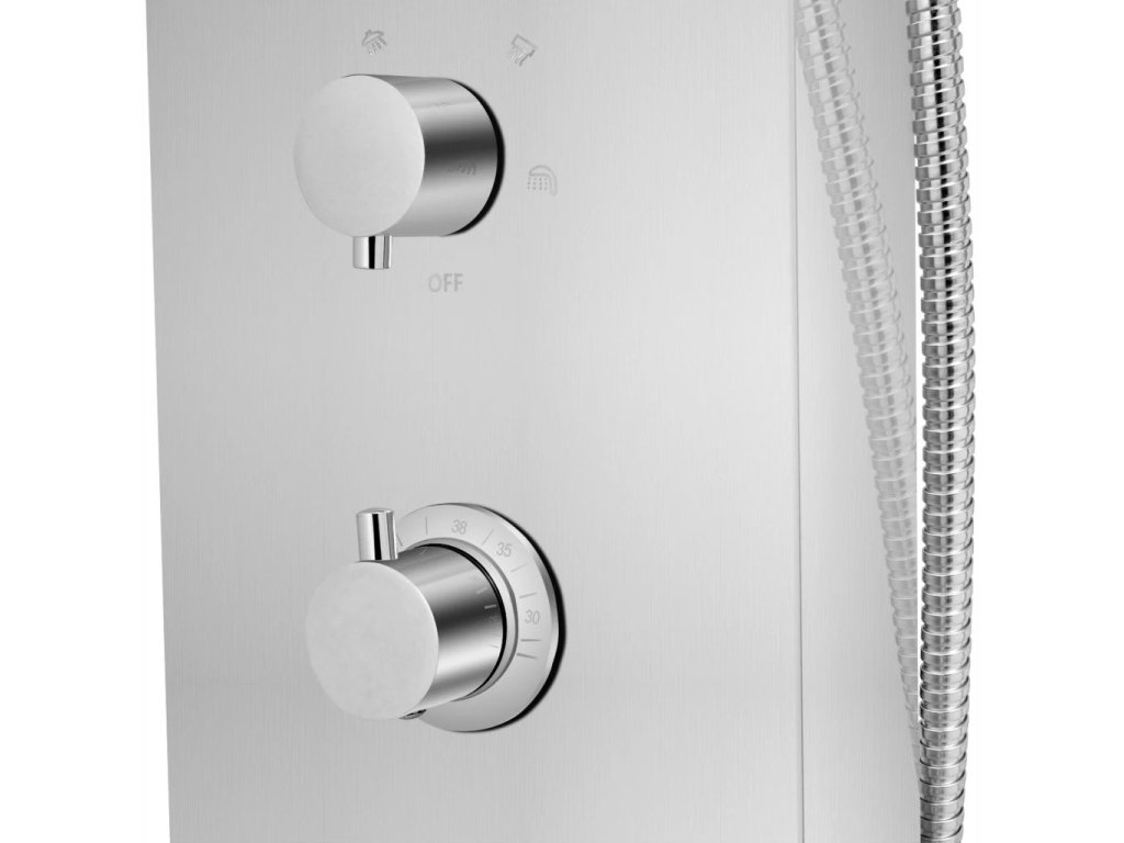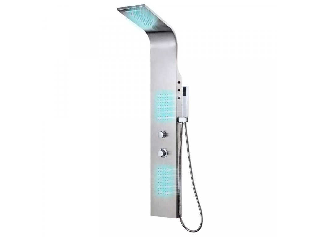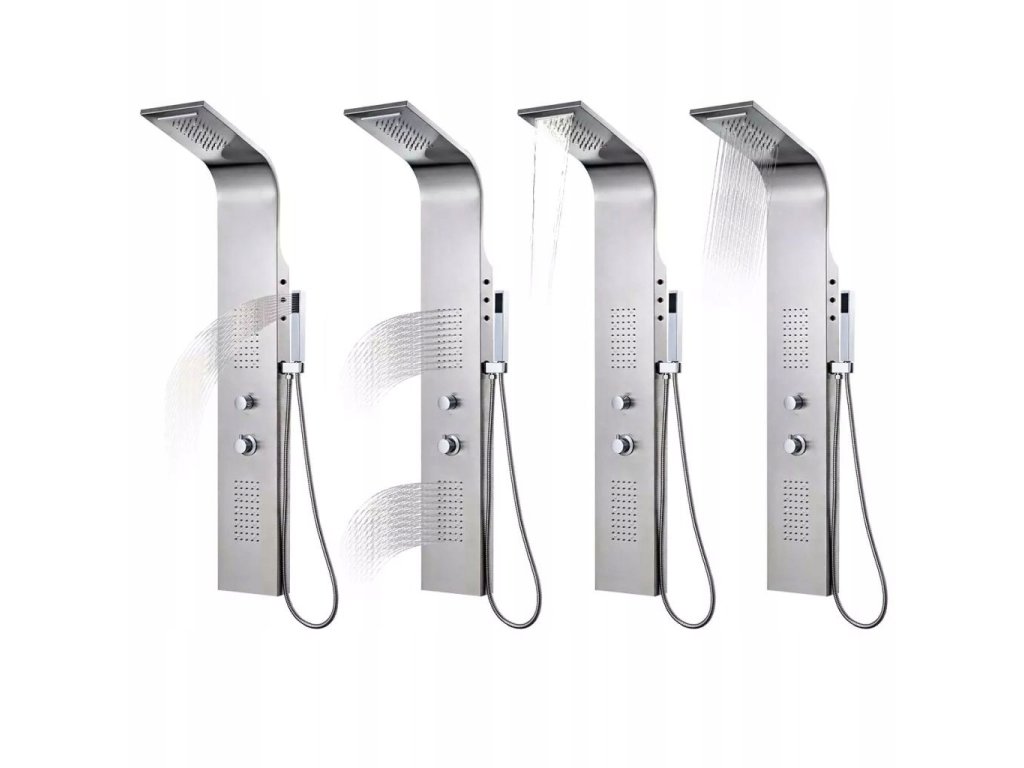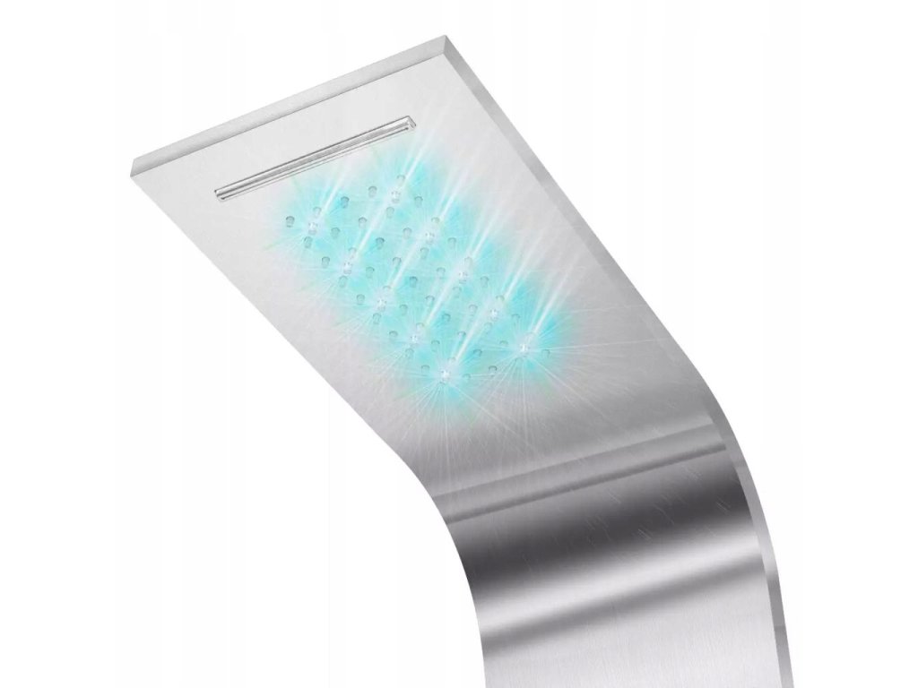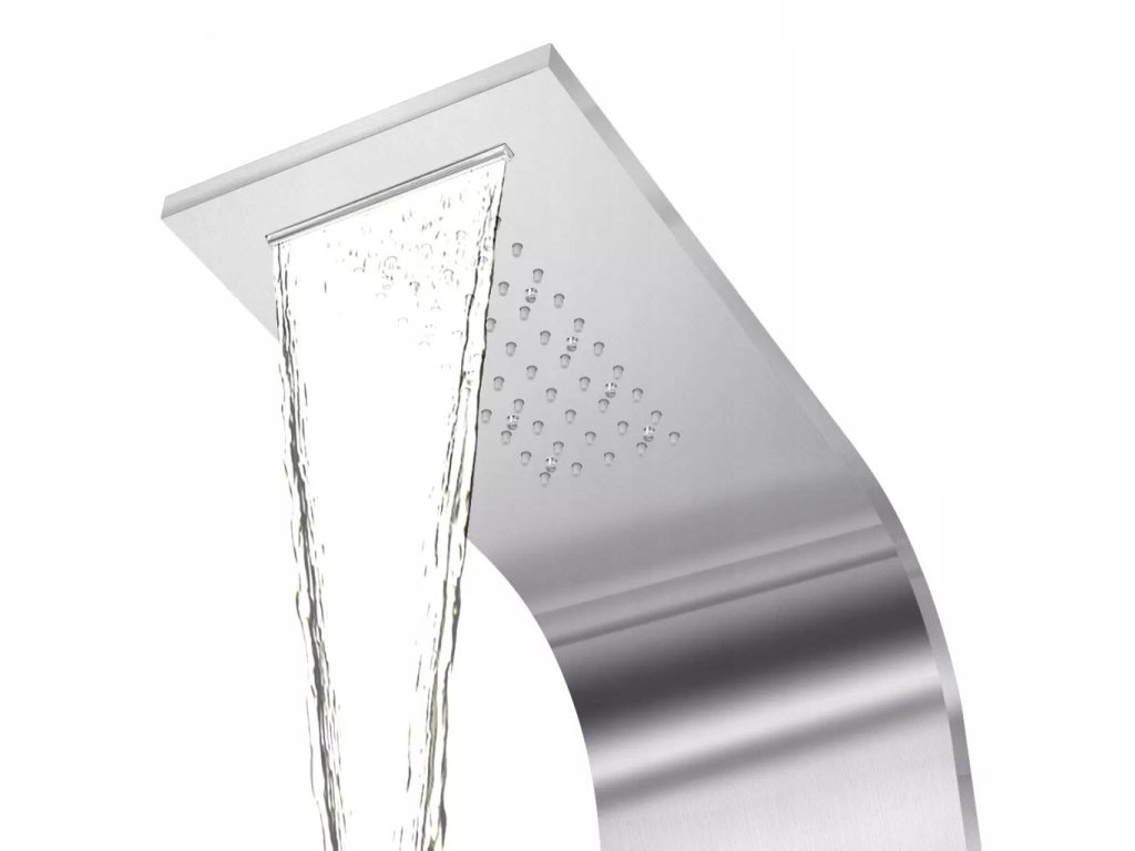 Panel jest wykonany z trwałej, nierdzewnej stali szczotkowanej oraz ma piękną, zakrzywioną formę. Posiada cztery funkcje: deszczownicę, wodospad, dysze masażowe oraz słuchawkę, które mogą być wybrane za pomocą pokrętła. W zależności od Twojego nastroju, możesz włączyć lub wyłączyć diody LED. Pokrętło termostatu pozwala ustawić temperaturę wody.