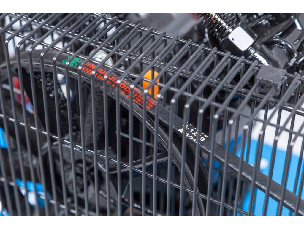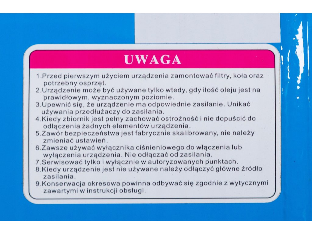 Kompresor wyposażony został w kółka oraz metalowe uchwyty. Takie oprzyrządowanie znacząco ułatwia przemieszczanie urządzenia oraz odpowiednie jego ustawienie w miejscu pracy.