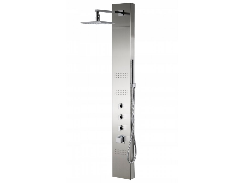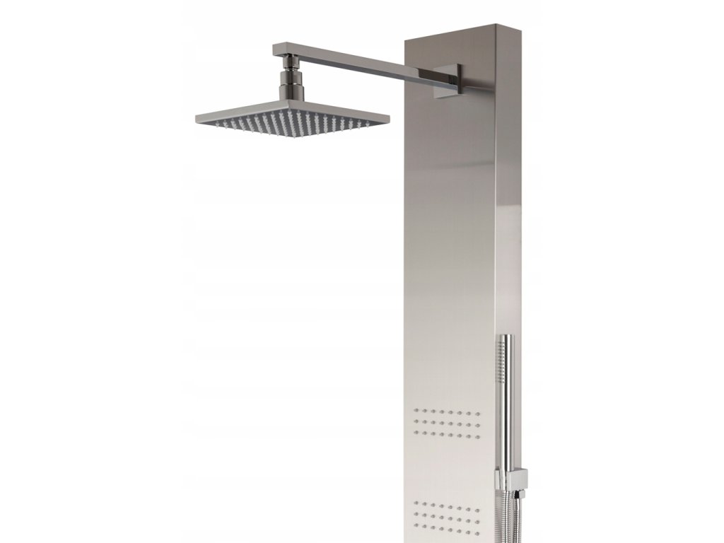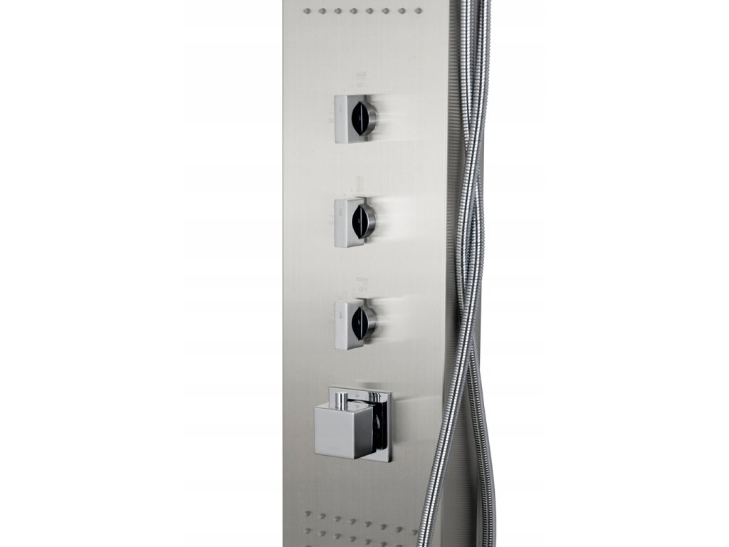 Sprchový panel z brúsenej ocele. Model je k dispozícii s dažďovou sprchou s LED osvetlením (92 dýz) alebo bez osvetlenia (96 dýz), tri hydromasáže s 24 dýzami, mosadzná sprchová hlavica. Všetky dýzy sú vyrobené z Anti-Calc. Každý gombík bol priradený k jednej funkcii. To znamená, že môžeme využívať všetky funkcie ponúkané panelom naraz. Je možné nainštalovať poter s tlakovým spínačom.