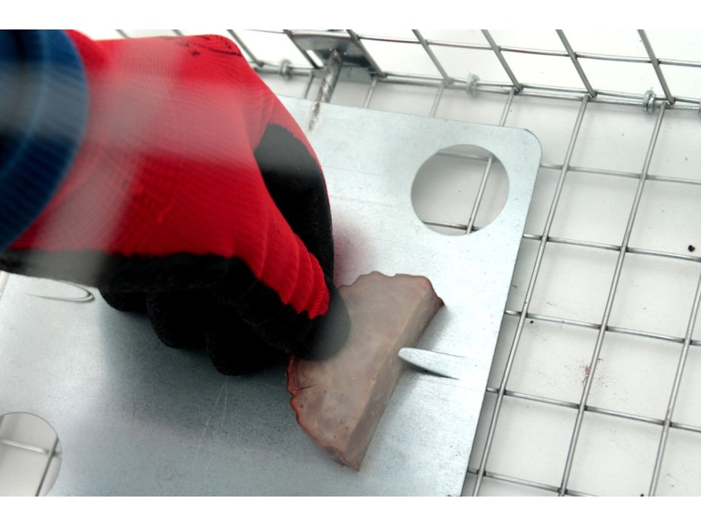 Pułapka została wyposażona w tzw. klapkę rewizyjną, umiejscowioną na bocznej ściance pułapki. Jej zadaniem jest bezproblemowe zakładanie zanęty - jest to istotne i bardzo wygodne, by nie sięgać ręką w głąb pułapki ! W większości konkurencyjnych pułapek przedmiotowa klapka rewizyjna to najsłabsze ogniwo - silny zwierz może wyrwać słabo zabezpieczona klapkę.
