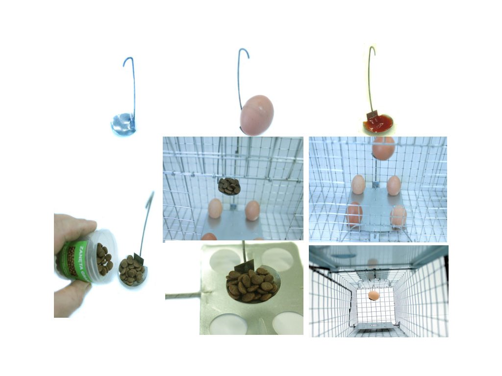W naszej pułapce opisaną powyżej tacę zanętową (czterootwworową) można wykorzystać do stworzenia tzw."gniazda jaj" - należy dołożyć kilka jaj (zdj. obok). Widok gniazda wypełnionego dużą ilości jaj sprawia, iż zwierzaki próbują je wyciągnąć. Zwierzęta zazwyczaj się na to nabierają. Kiedy wyciągną chociażby jedno z jaj, poruszają tacę, a ta z kolei uruchamia mechanizm zamykający pułapkę