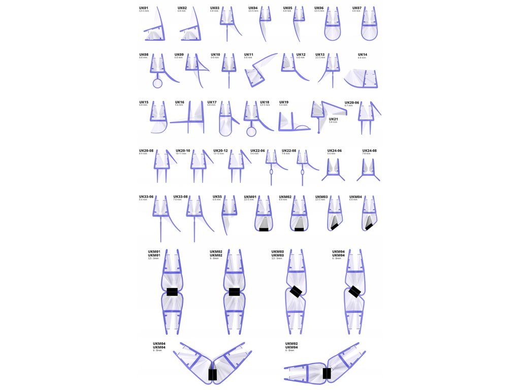 Väčšina modelov tesnení je tiež k dispozícii v ohnutej verzii pre polkruhové kabíny. Magnetické tesnenia UKM pre dvere sprchových kútov sú k dispozícii iba v dĺžke 200 cm.