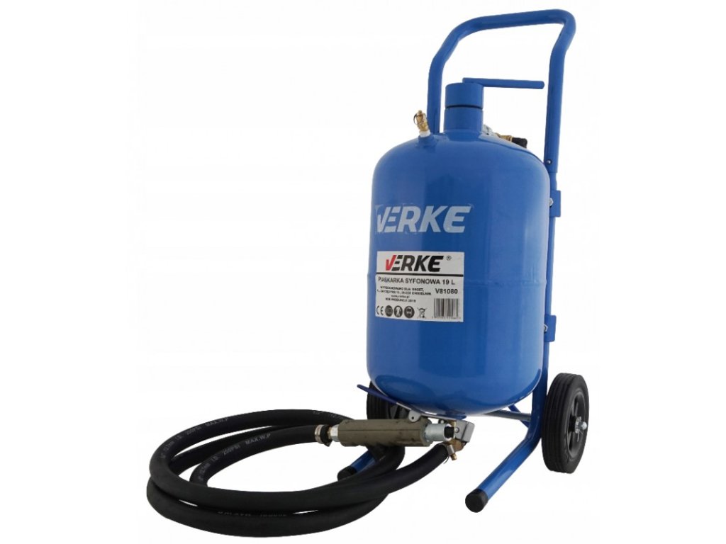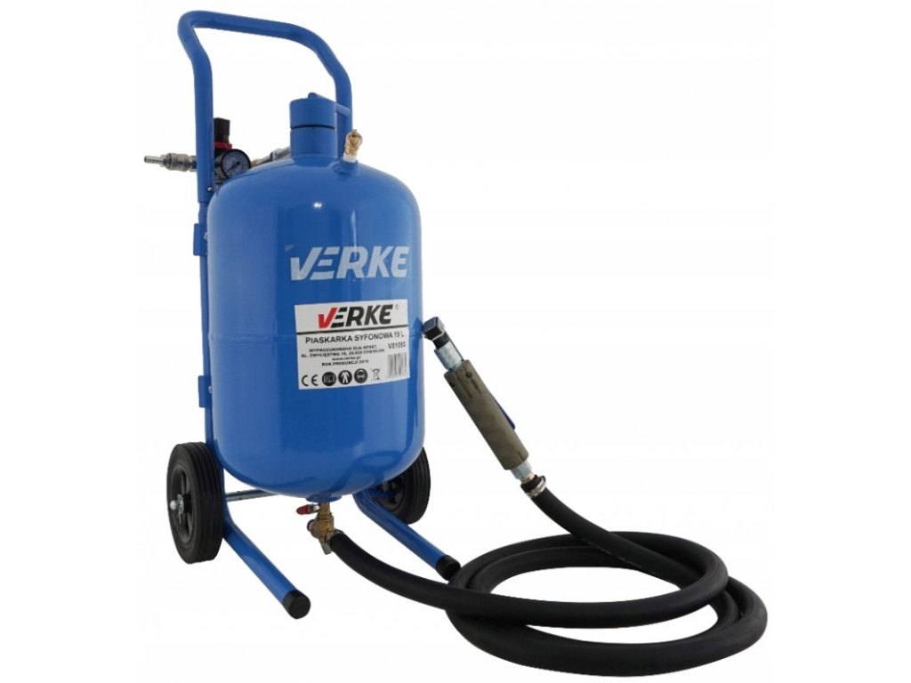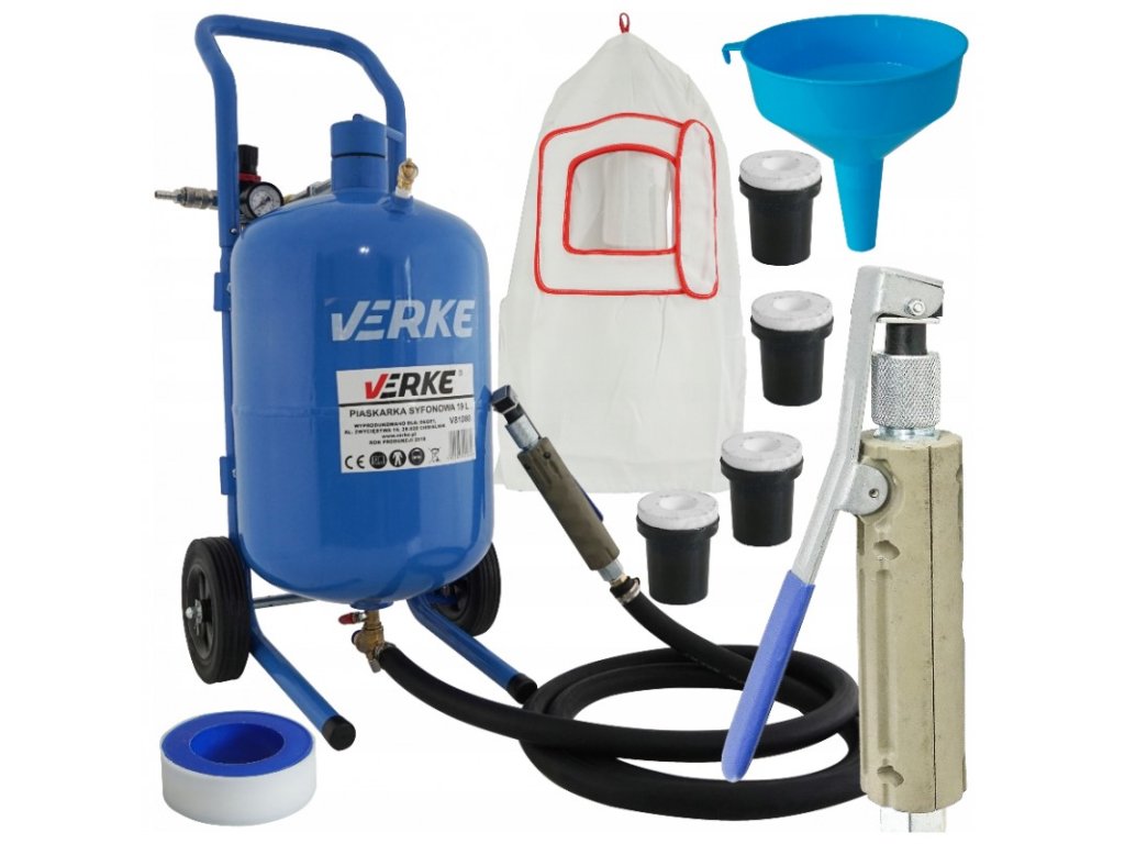 Piaskarka mobilna syfonowa 19l. Zestaw zawiera wszystkie potrzebne rzeczy do piaskowania. Wystarczy podłączyć go pod kompresor i nasypać do zbiornika piasek.