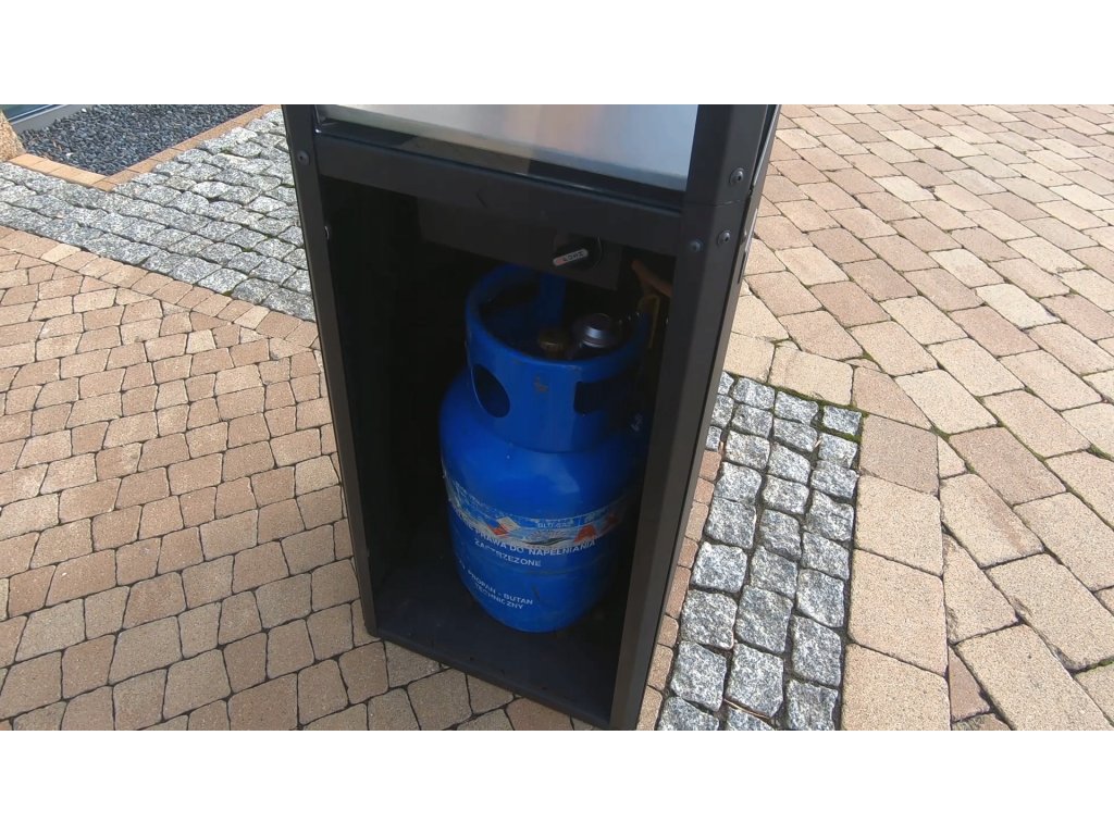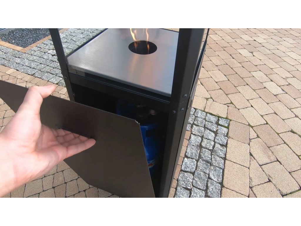 Ogrzewacz Umbrella zasilany jest płynnym gazem z butli ukrytej w obudowie. Płomienie są zamknięte w specjalnej komorze , która osłania nas przed bezpośrednim kontaktem z ogniem.