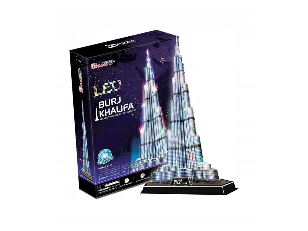 3D LED PUZZLE BURJ KHALIFA je vzrušujúca zábava pre deti a zberateľov architektúry z celého sveta. V balení je 136 ks puzzle vyrobené zo špeciálneho penového materiálu. Puzzle sú očíslované, vystrihnuté a umiestnené na listoch. Stačí vytlačiť prvok z peny bez použitia sily a zostaviť ho podľa priloženého návodu, bez použitia lepidla alebo špeciálnych nástrojov. Hotová konštrukcia je umiestnená na podstavci s LED diódami vo vnútri. Takto osvetlená 3D puzzle budova vyzerá pri vypnutom svetle fenomenálne. Rozmer konštrukcie po zložení je 39 x 34 x 146 cm. Odporúčaný vek dieťaťa 7+.