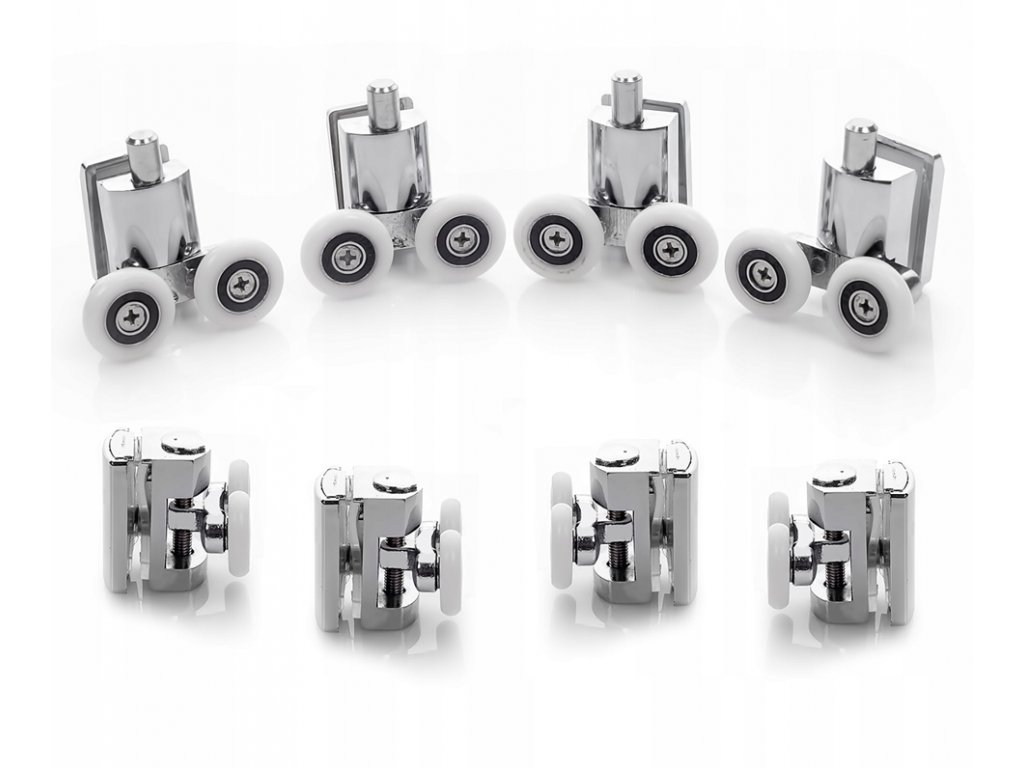 Rolki posiadają przycisk wypinający i regulację wysokości łożyska. Rolki dolne posiadają przycisk pozwalający na wpięcie i wypięcie szyby. System ten ułatwia montaż drzwi w prowadnicy oraz czyszczenie kabiny dzięki łatwej i szybkiej metodzie demontażu szyby. Rolki górne mają możliwość regulacji wysokości w zakresie do 13mm. Śrubą regulującą położenie rolki poziomuje się też ustawienie szyby aby zapewnić szczelność kabiny. Zarówno w rolkach dolnych jak i górnych łożysko zamocowane jest na ruchomym trzpieniu przez co rolki można z powodzeniem stosować w kabinach półokrągłych.