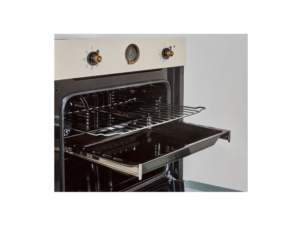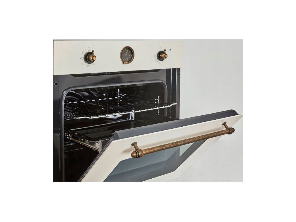 Piekarnik elektryczny 5-funkcyjny z termoobiegiem. Grill. Szerokość 60cm. Pojemność piekarnika 67l. Płaski front. Sterowanie mechaniczne z zegarem analogowym z funkcją wyłączania. Tryb półautomatyczny z funkcją programowania czasu trwania pieczenia. Wnętrze piekarnika pokryte emalią łatwą do czyszczenia. Jednopoziomowe prowadnice teleskopowe. Oświetlenie wnętrza piekarnika LED. Tylny samoczyszczący panel katalityczny.  Miękkie domykanie drzwiczek piekarnika, typu Soft Close. Podwójna szyba drzwiczek z szybą termo-refleksyjną. Zdejmowane drzwi oraz wyjmowana wewnętrzna szyba. Max. temperatura pieczenia: 240'C. Chłodzenie obudowy. Blokada rodzicielska. Klasa  energetyczna A. Wykończenie w kolorze Szampańskim. Linia estetyczna: Classico.