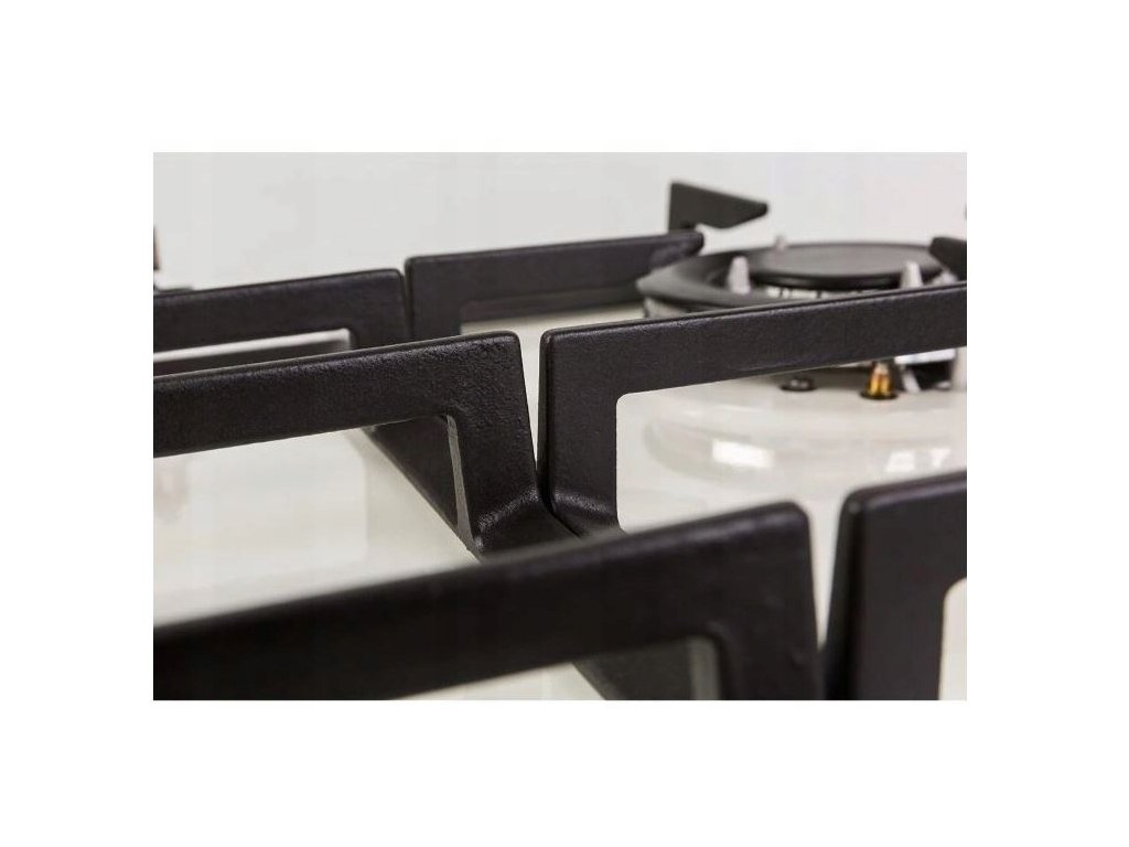 Ruszty i nakładki palników wykonane z żeliwa nadają płycie prestiżowego wyglądu. Wysoka jakość żeliwa gwarantuje wieloletnią eksploatację i łatwe utrzymanie w czystości. Wszystkie ruszty żeliwne posiadają specjalne gumowe nakładki, które zapobiegają uszkodzeniom powierzchni, zapewniają stabilność rusztów, eliminują hałas i wibracje.