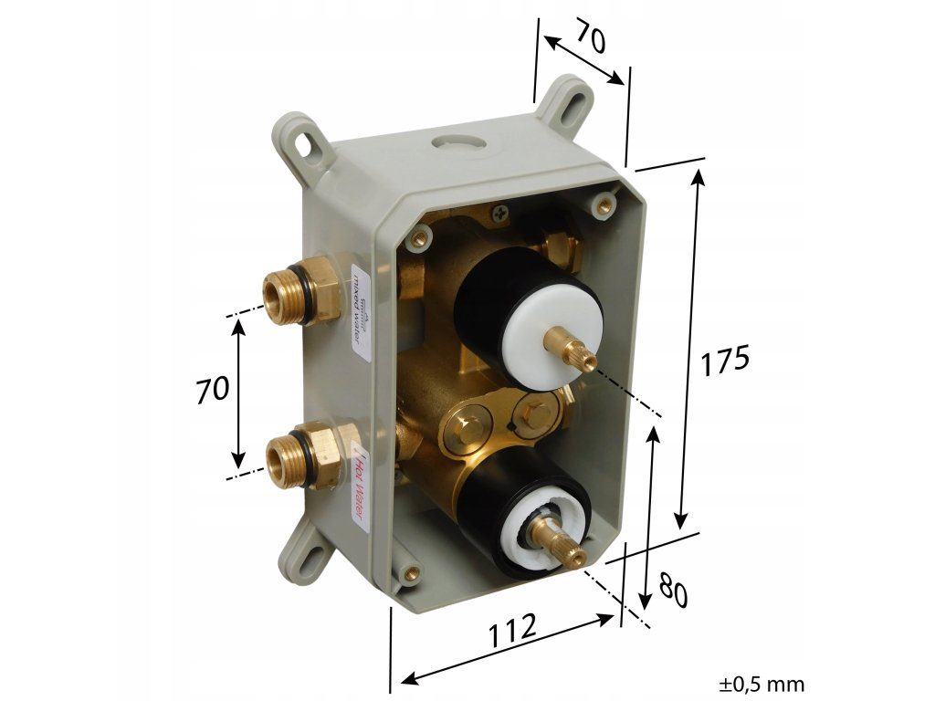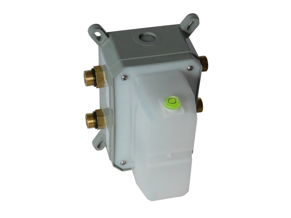Mieszacz podtynkowy, termostatyczny, 2 funkcyjny, umieszczony w specjalnej obudowie montażowej, wykonany z mosiądzu z wykończeniem ze stali nierdzewnej S304, uchwyt do przykręcenia węża słuchawki 5 x 5 cm wykonany z mosiądzu chromowanego.