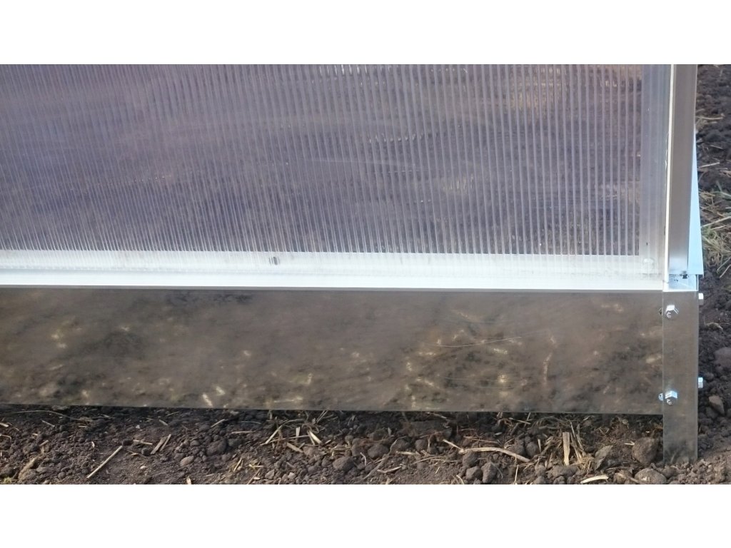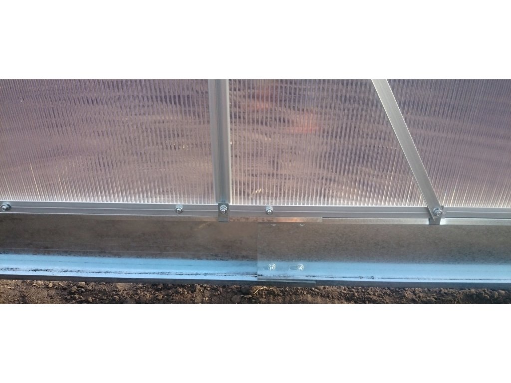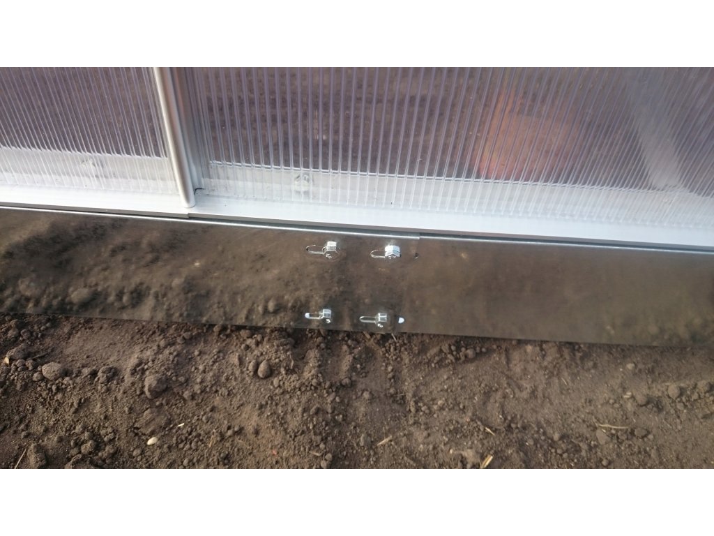 W komplecie fundament ze stali ocynkowanej o wysokości około 11cm, który należy osadzić w ziemi a następnie zamocować szklarnię za pomocą specjalnych klipsów zaciskowych załączonych w zestawie.