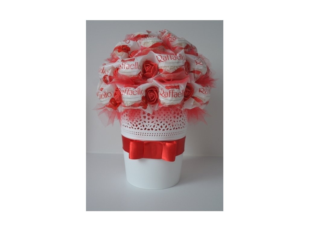 Na tejto aukcii navrhujem veľká kytica v kvetináči s asi 28 kusmi cukroviniek Rafaello v červených farbách.