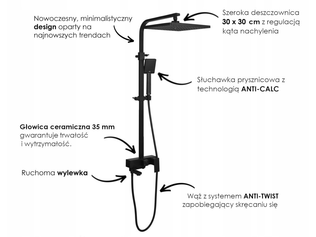 Nowość na rok 2020. W zestawie bateria prysznicowa z mieszaczem temperaturyregulacją przełącznikiem strumienia wody między deszczownicą, słuchawką, a wylewką. Ceramiczna głowica baterii (35 mm) gwarantuje trwałość wytrzymałość. Zestaw zawiera szeroką, stylową deszczownicę o wymiarach 30 x 30 cm oraz słuchawkę prysznicową w czarnym matowym kolorze - obydwa elementy z nowoczesnym systemem ANTI-CALC. Dzięki zastosowaniu wylewki, zestaw sprawdzi się nie tylko w kabinie prysznicowej, ale również nad wanną.Design zestawu został podporządkowany najnowszym trendom na rok 2020 - prezentuje się niezwykle elegancko i idealnie pasuje do nowocześnie urządzonej łazienki.