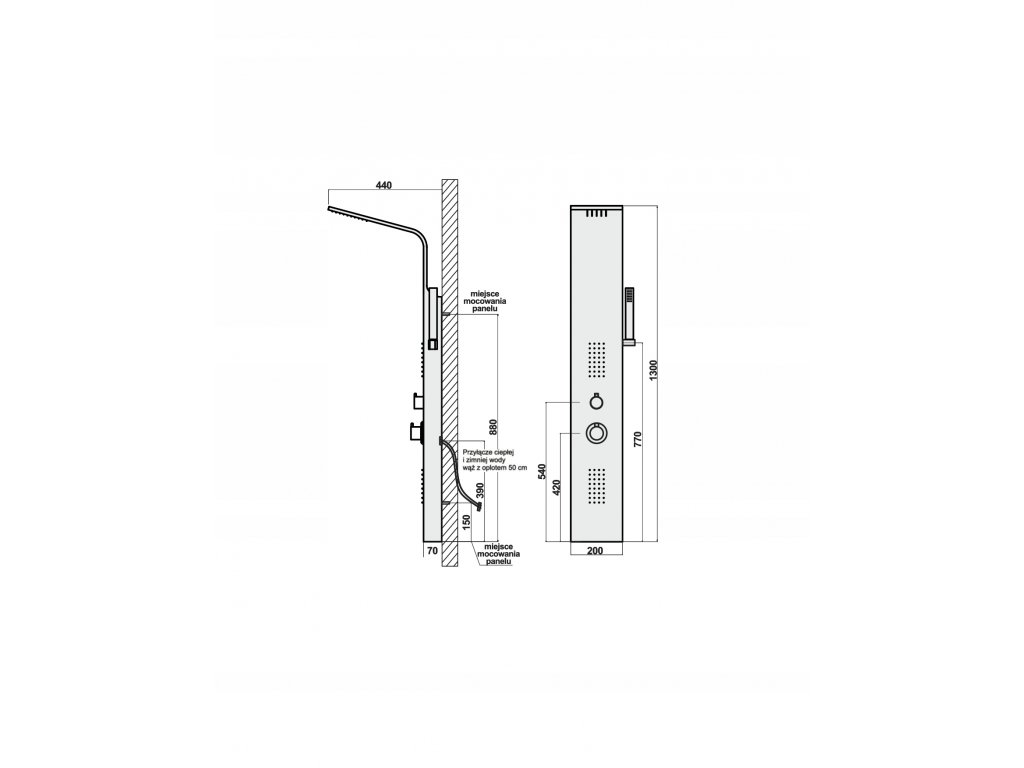 zawieszenia panela: śruby, węże giętkie do podłączenia ciepłej-zimnej wody.